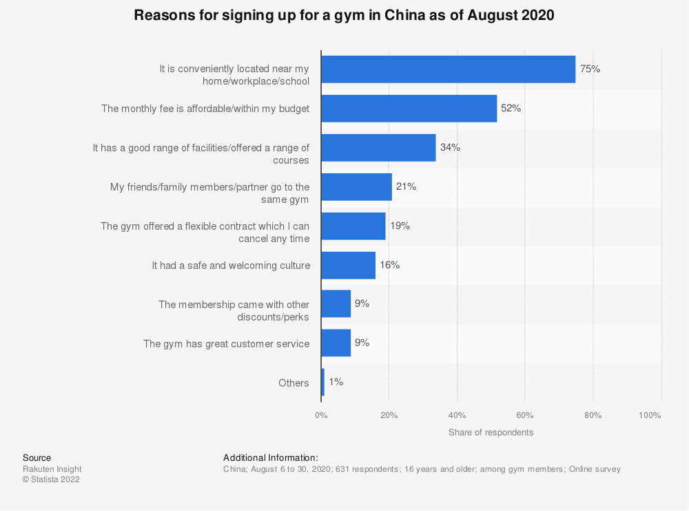 根据 Rakuten Insight一项关于2020年在中国注册健身房会员的调查,约75%的受访者表示,健身房的位置是选择健身房的最关键因素。同时,对约52%的受访者来说,实惠的价格水平是一个有吸引力的因素。