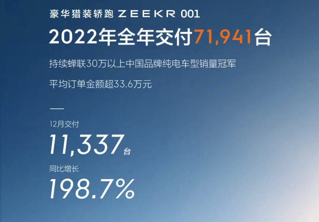 相比之下,极氪的表现让人眼前一亮,2022年交付量突破7万辆,完成年度交付目标,在主要依靠极氪001一款车型的基础上,年交付量与问界仅差4000辆。同时,极氪发布的信息显示,2022年,极氪平均订单金额超过33.6万元。