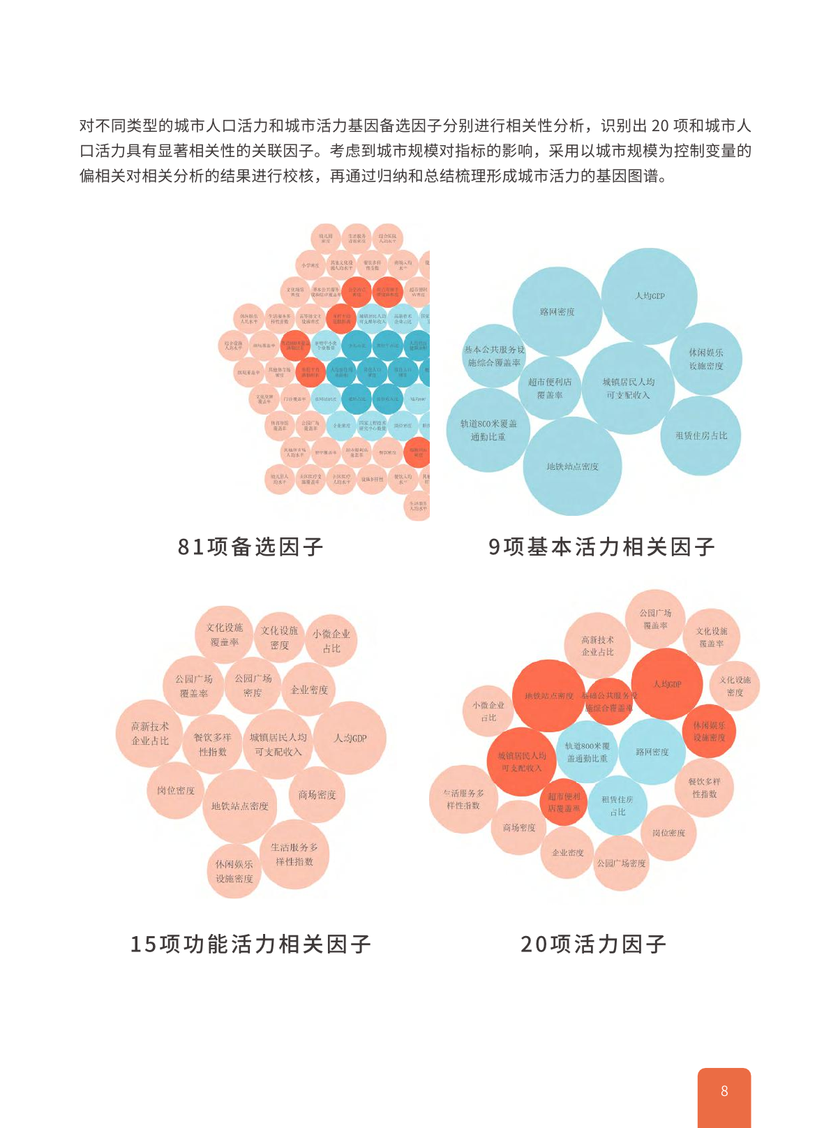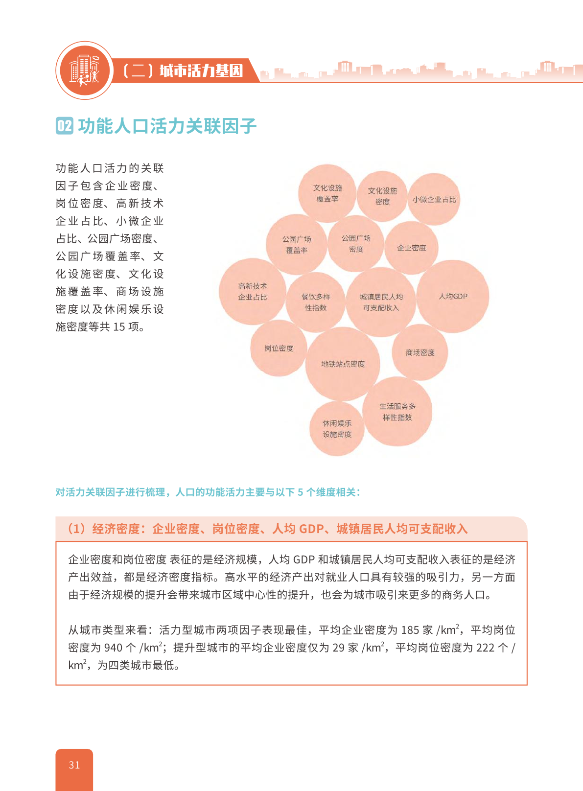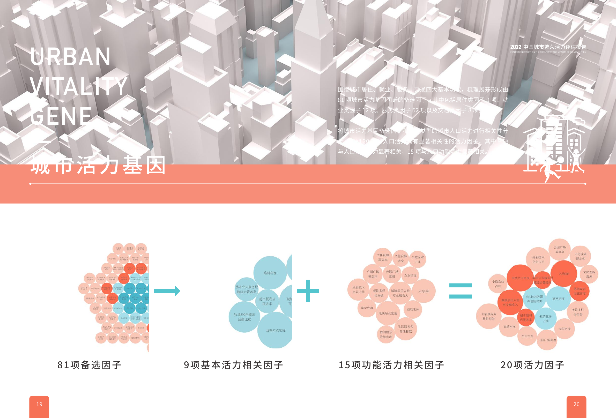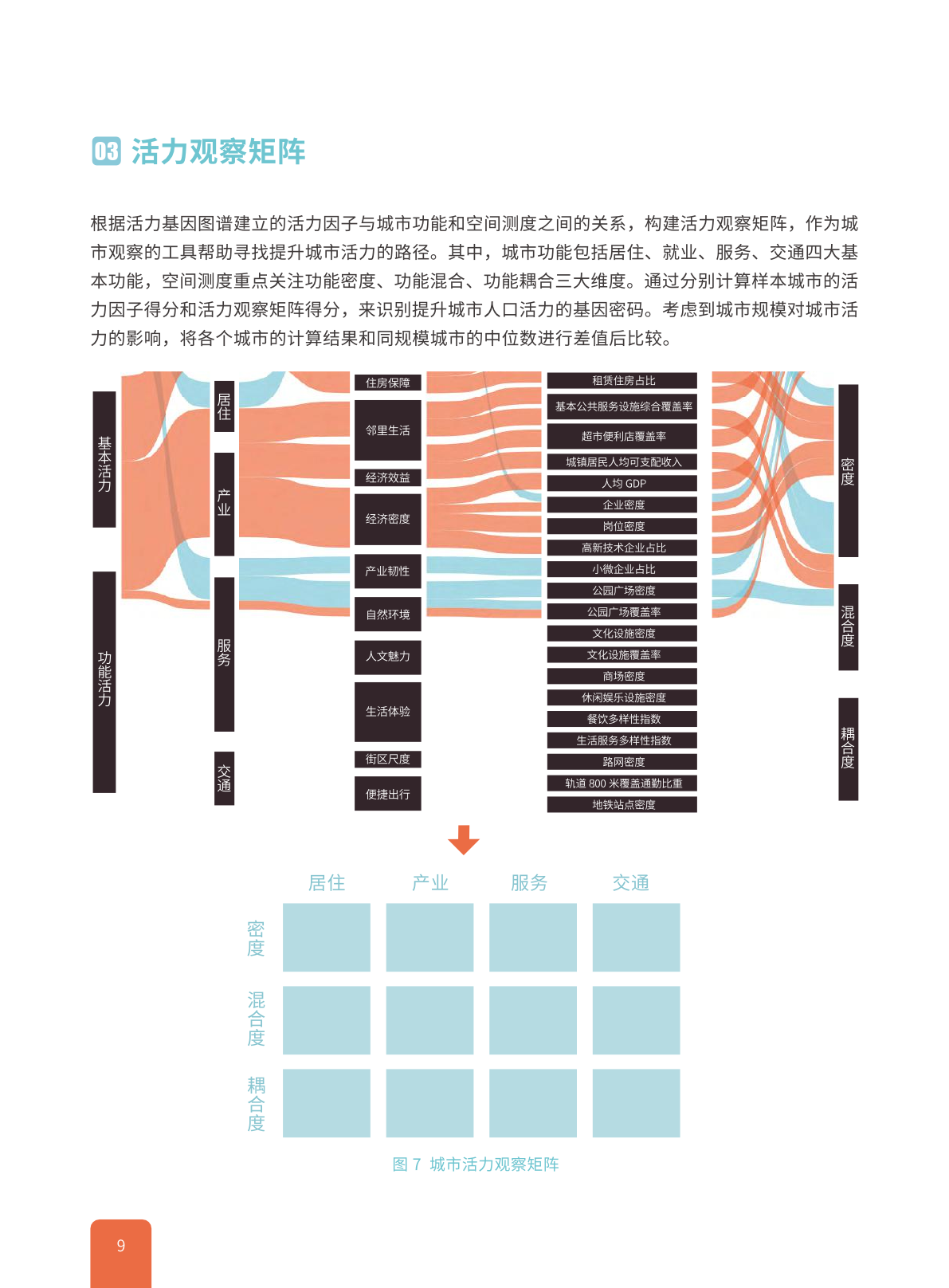 《报告》在评估方法上使用了三个工具。一是“活力指标体系”,即从基本活力(常住人口吸引力)和功能活力(外来商务人口、外来休闲人口吸引力)两方面构建城市活力指标体系,对城市活力进行评估。二是“活力基因图谱”,即从城市居住、就业、服务、交通四大功能出发,提出 81 项指标构成的备选因子,通过相关性分析,识别出 20 项和城市人口活力显著相关的关联因子,进而建立一套由“活力类型-城市功能-活力因子-空间测度”构成的城市活力基因图谱。三是“活力观察矩阵”,即通过居住、就业、服务、交通四个功能维度和密度、混合度、耦合度三个空间维度形成观察矩阵,帮助城市寻找提升活力的路径。