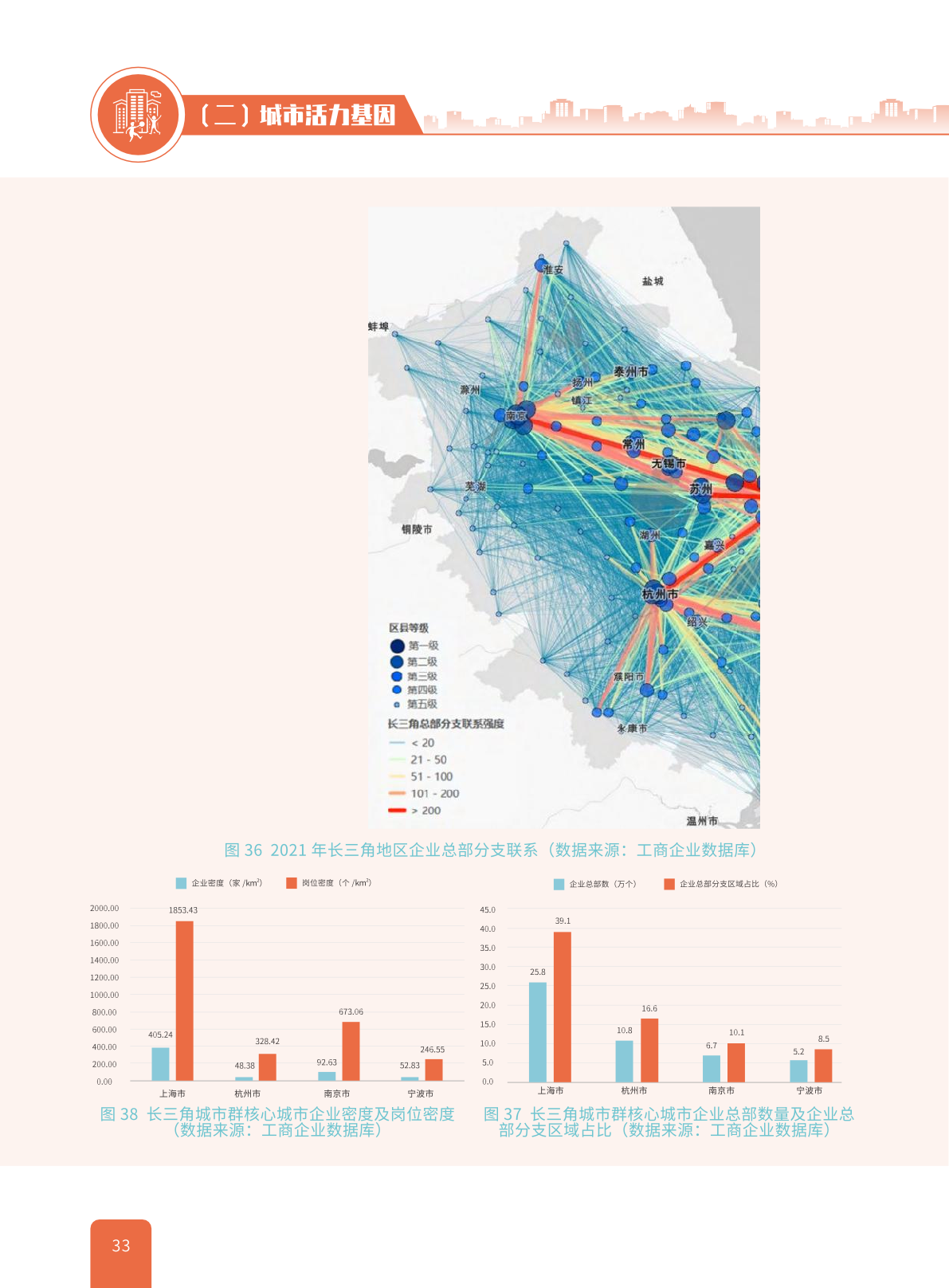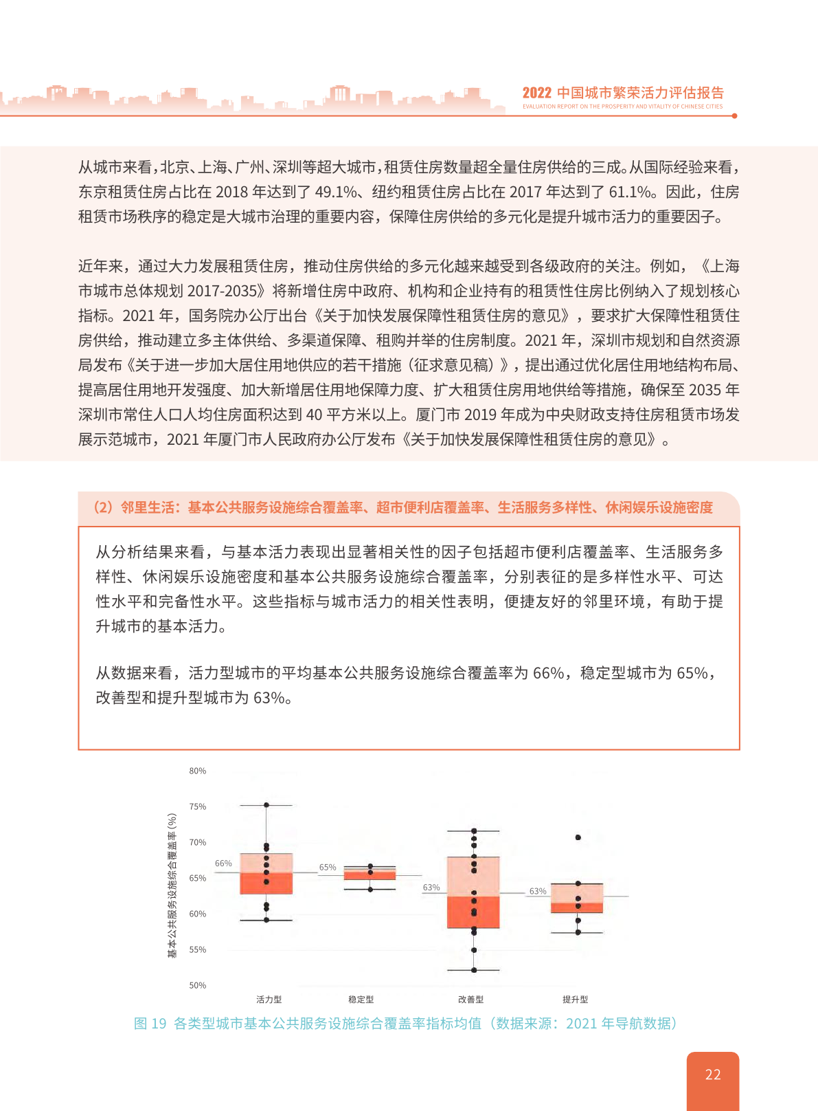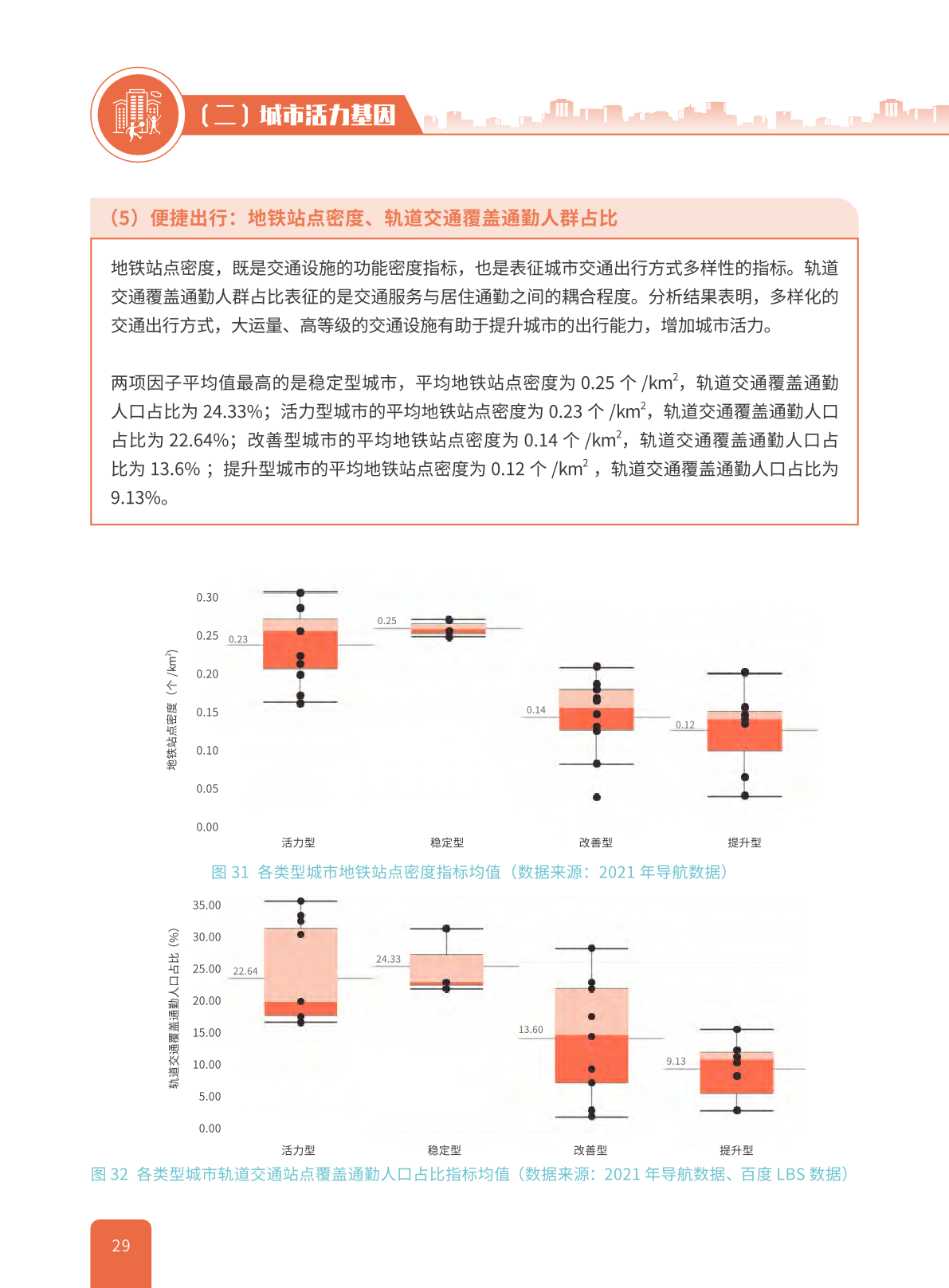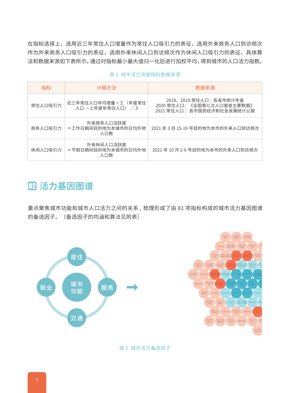 《报告》在评估方法上使用了三个工具。一是“活力指标体系”,即从基本活力(常住人口吸引力)和功能活力(外来商务人口、外来休闲人口吸引力)两方面构建城市活力指标体系,对城市活力进行评估。二是“活力基因图谱”,即从城市居住、就业、服务、交通四大功能出发,提出 81 项指标构成的备选因子,通过相关性分析,识别出 20 项和城市人口活力显著相关的关联因子,进而建立一套由“活力类型-城市功能-活力因子-空间测度”构成的城市活力基因图谱。三是“活力观察矩阵”,即通过居住、就业、服务、交通四个功能维度和密度、混合度、耦合度三个空间维度形成观察矩阵,帮助城市寻找提升活力的路径。
