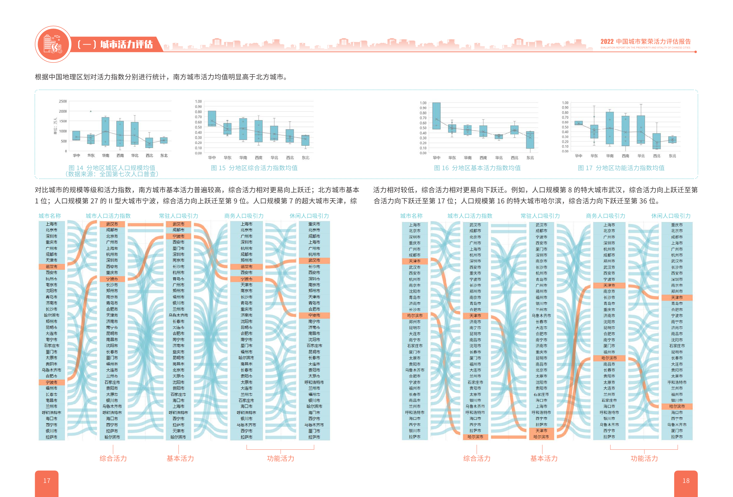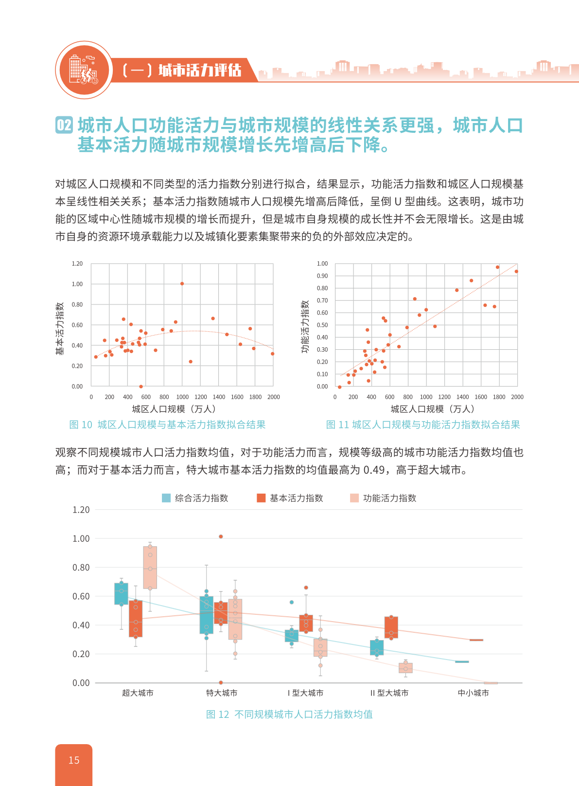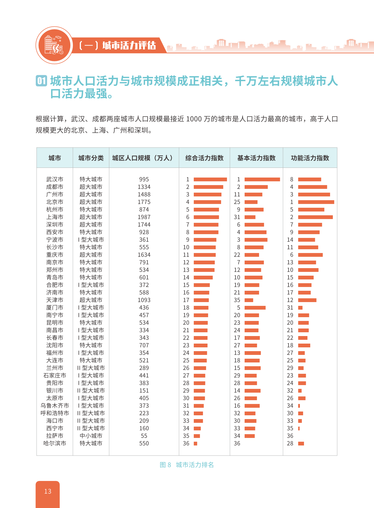 《报告》的主要结论:一是城市人口活力与城市规模成正相关,千万左右规模城市的活力最强;二是城市活力存在区域差异,中部城市人口活力强,南方城市活力高于北方城市;三是城市基本活力与居住、交通功能关联强;功能活力与产业、服务功能联系密切。