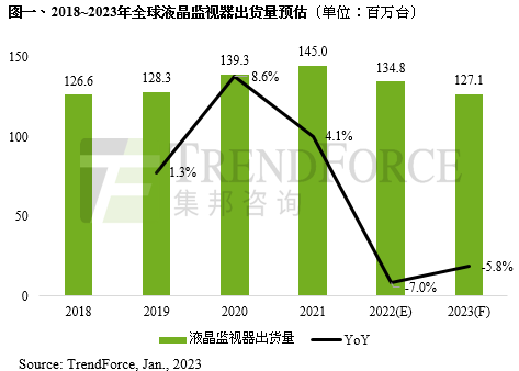 据TrendForce集邦咨询研究显示,2022年液晶监视器预计出货量为1.35亿台,年减7%。尽管2022上半年整体出货表现相当稳定,但下半年在企业预算缩减下,商务需求明显放缓,消费市场也在通胀及升息效应持续扩大下,导致消费性电子产品需求大幅削减。考虑疫情带动的需求红利退场及国际环境的不确定,预估2023年液晶监视器出货量约1.27亿台,年减幅度约5.8%,恢复至疫情前水平。