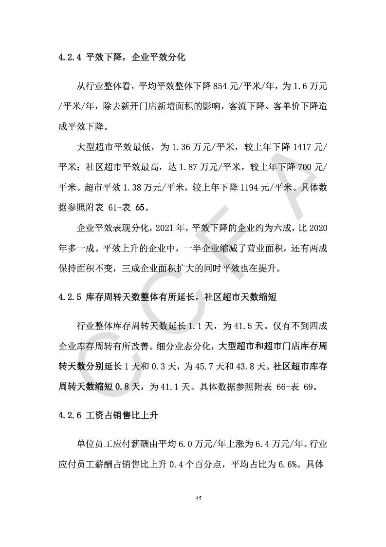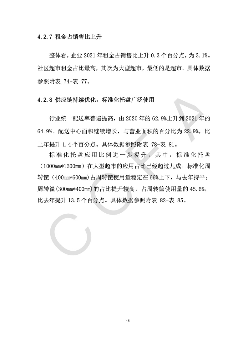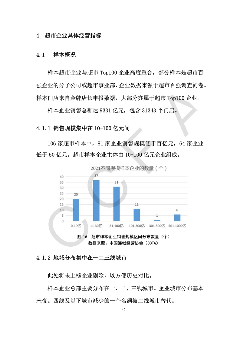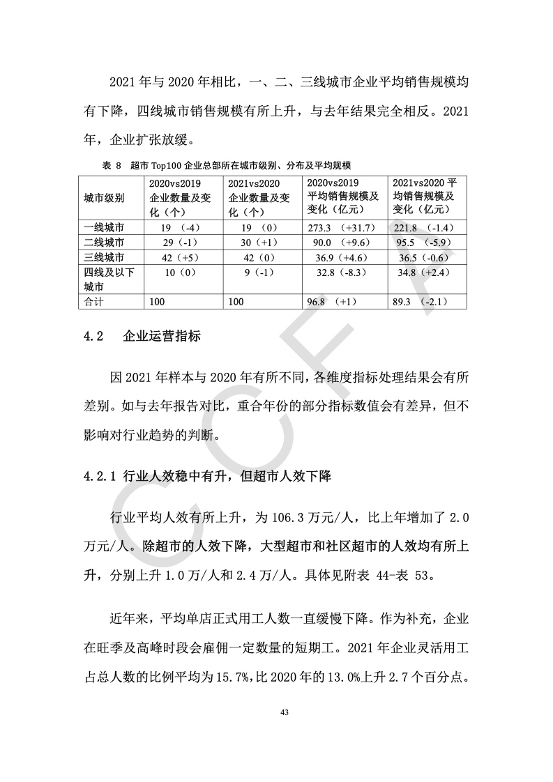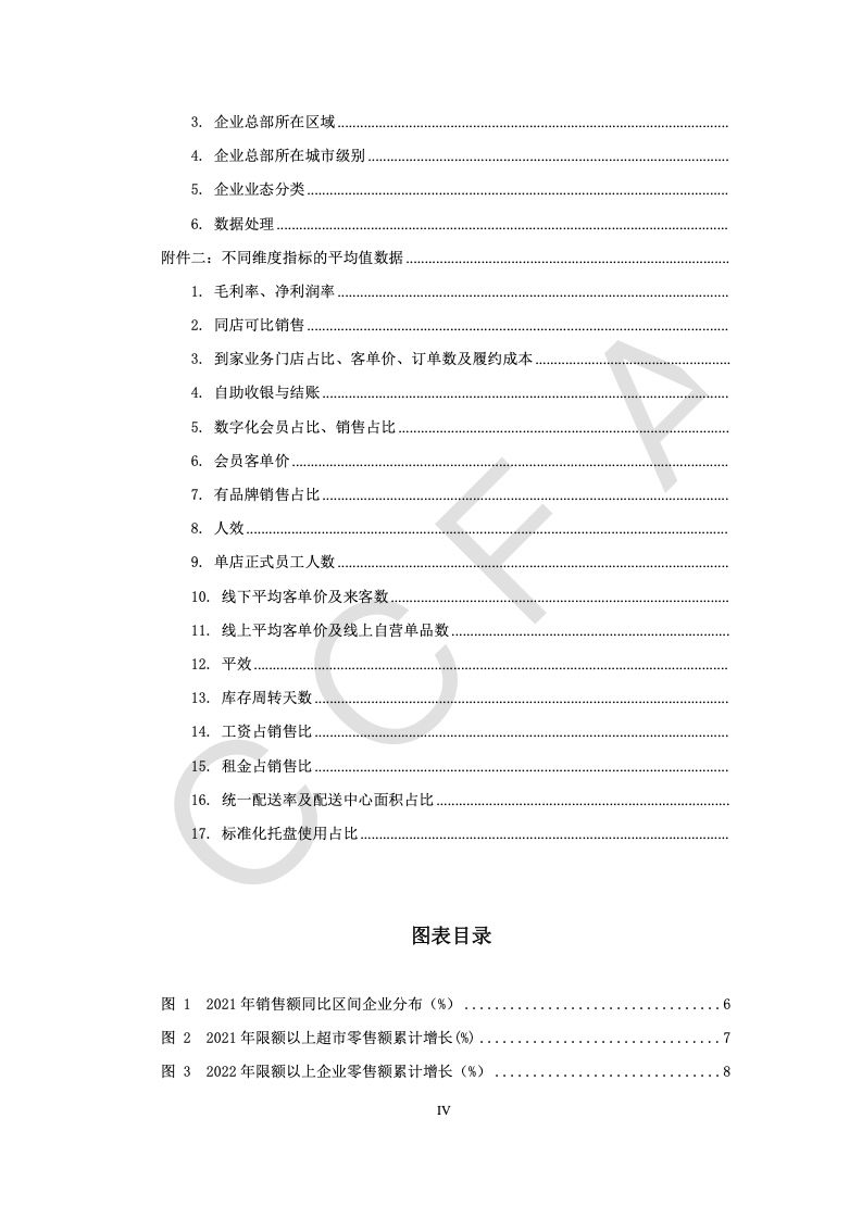报告最后部分提供部分关键指标的行业数据。此数据基于2021年行业调研数据和超市业态调研数据,从企业层面和门店层面对经营的关键指标进行处理,从企业销售规模、门店规模、企业总部所在区域、超市细分业态四个维度(部分指标提供城市级别维度)计算行业平均值,为超市企业提供经营指标对标基准。