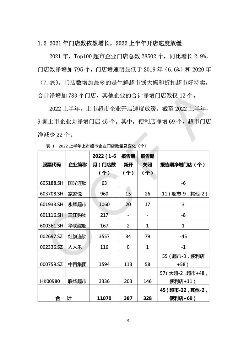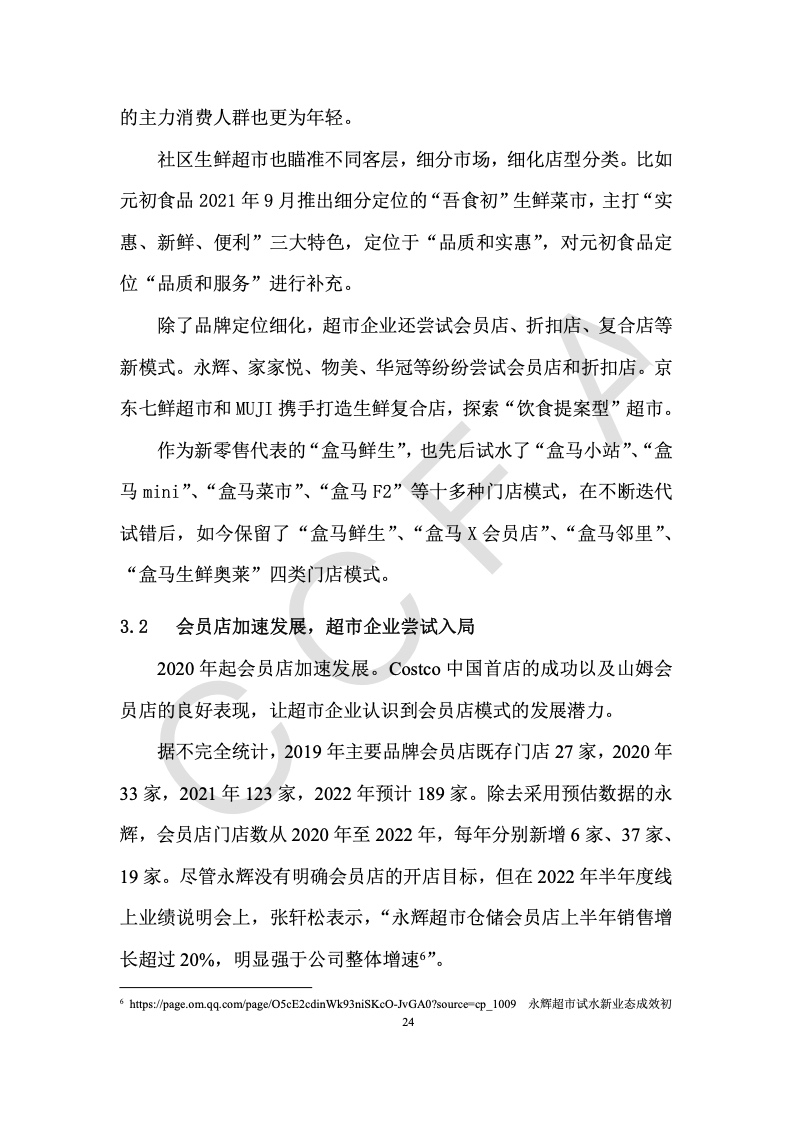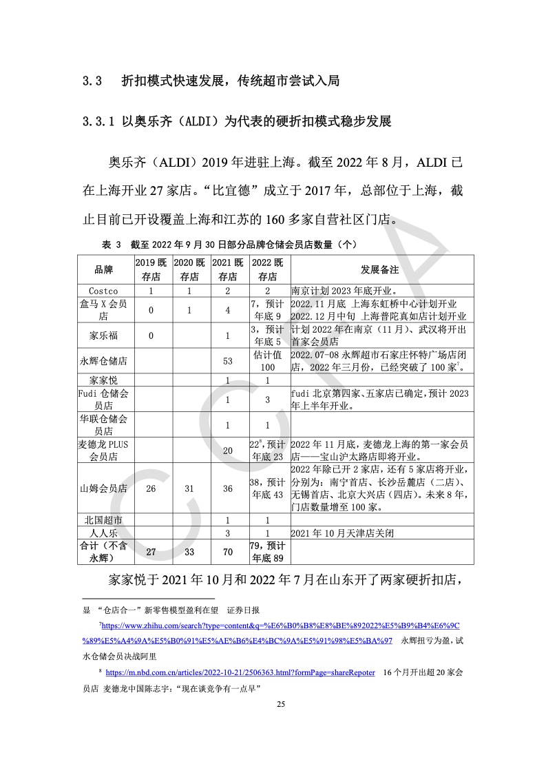 2.近两年会员店和折扣店发展较好,超市企业尝试进入。2019年主要品牌会员店既存门店27家,2020年33家,2021年123家,2022年预计189家。除去采用预估数据的永辉,会员店门店数从2020年至2022年,每年分别新增6家、37家、19家。以好特卖(HotMaxx)、奥乐齐(ALDI)等为代表的软硬折扣店快速发展,也让超市企业看到自身的优势与不足,探索尝试。