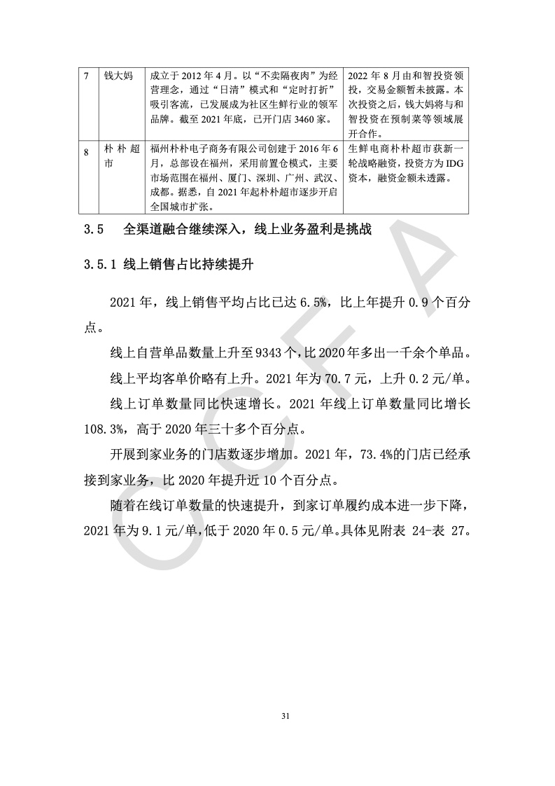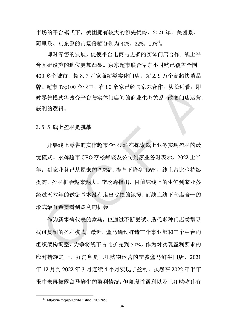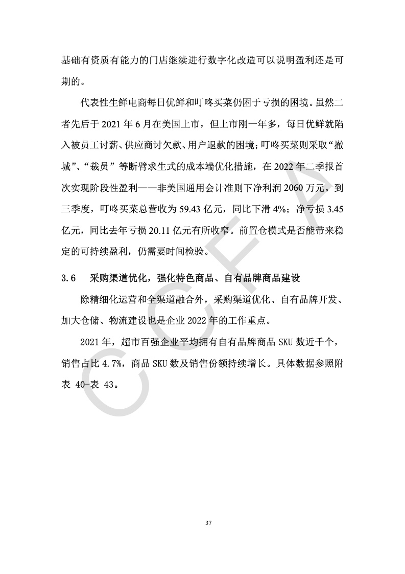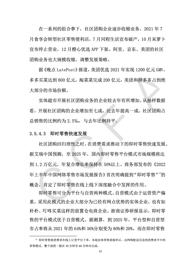 4.全渠道融合继续深入,线上渠道运营模式日渐细分。直播成为实体超市线上零售渠道的补充;社区团购回归理性;即时零售快速发展。但线上业务实现赢利依然是大多数企业面临的挑战。