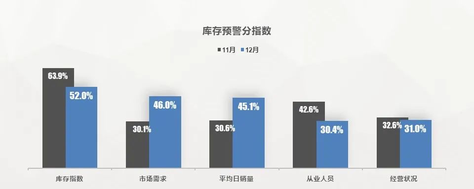 从分指数情况看:12 月库存、从业人员、经营状况指数环比下降,市场需求、平均日销量指数环比上升。在短期疫情冲击下,经销商员工感染率较高,短期人员损失较大。