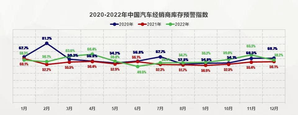 2022 年 12 月 31 日,中国汽车流通协会发布的最新一期 “中国汽车经销商库存预警指数调查”VIA(Vehicle Inventory Alert Index)显示,2022 年 12 月中国汽车经销商库存预警指数为 58.2%,同比上升 2.1 个百分点,环比下降 7.1 个百分点,库存预警指数位于荣枯线之上。