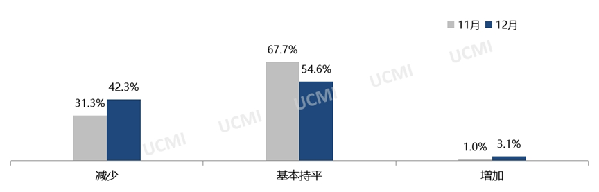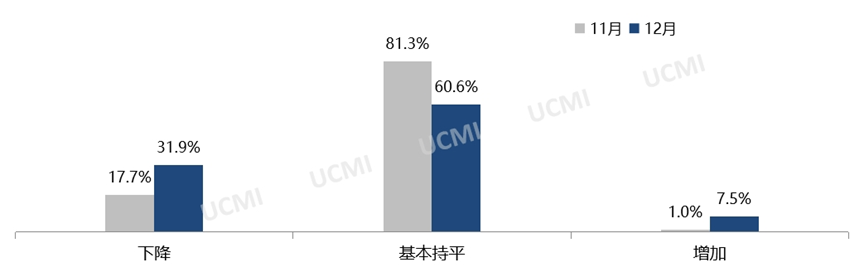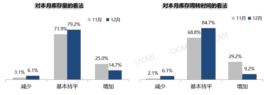 调查显示,12月份库存量与库存周转时间均有所增加。其中认为库存量“增加”的经理人比例为14.7% ;认为库存周转时间“增加”的比例为9.2%。