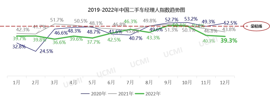 2023年1月3日,中国汽车流通协会发布最新一期“中国二手车经理人指数”(UCMI)。本期UCMI结果显示,12月份二手车经理人指数为39.3%,相比11月份继续下降1个百分点,处于荣枯线以下,二手车市场景气度降低。