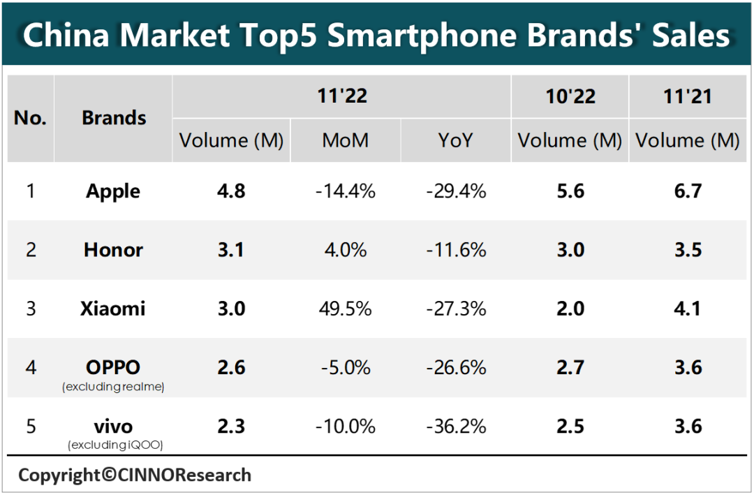 11月国内智能机市场Top5主流品牌销量同比均呈现负增长,降幅11.6%-36.2%区间,安卓阵营荣耀表现亮眼,同比跌幅最小且小于智能机整体降幅,环比销量增至4%;小米销量环比增长49.5%,主要得益于“双十一”促销季线上销量带动,其中红米K50至尊版排名单机销售榜第八位。