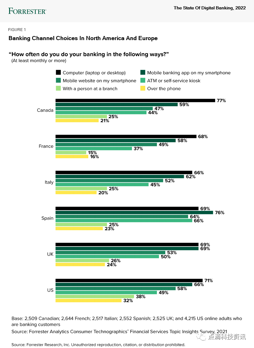 考虑到消费者预期的巨大转变,这些数字令人惊讶。趋势清楚地表明,客户希望他们的金融服务数字化。最重要的是,根据Forrester的数据,这是一个普遍存在的全球现象。在对世界各地使用网上银行的客户进行调查后,他们发现77%的加拿大客户、71%的美国客户和69%的西班牙客户至少每个月都会使用网上银行(Forrester)。这一趋势是不可否认的,更多的金融机构需要认真考虑投资全面的数字银行转型计划,以适应这一新的现实。