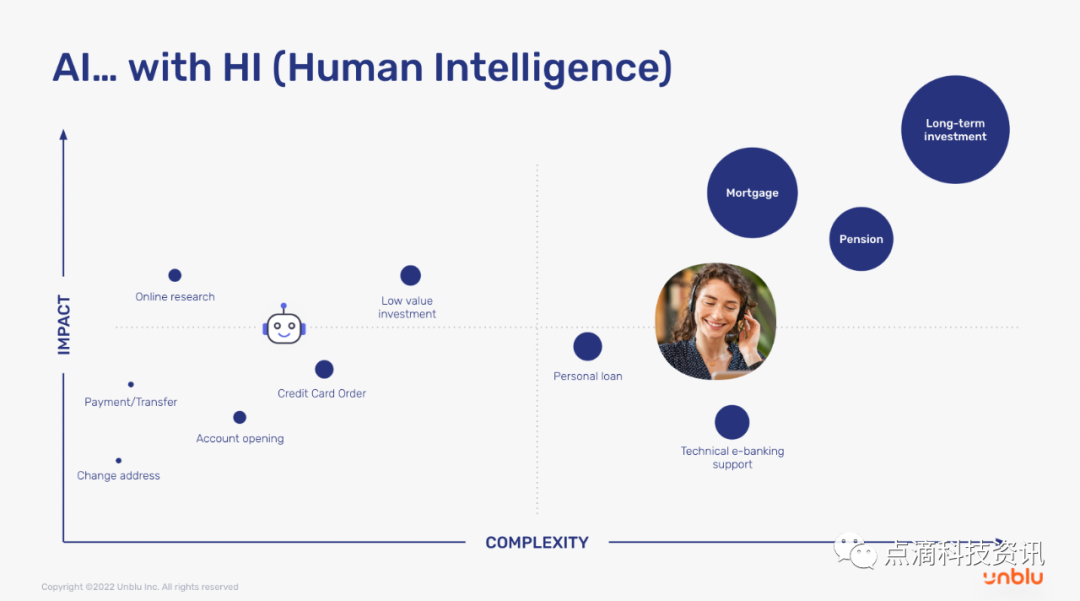 人工智能在客户服务中的另一个重要方面是聊天机器人的使用。作为最明显和最常用的自助服务选项,银行客户经常接触聊天机器人。然而,他们的表现没有达到最初的预期,因为糟糕的客户服务体验还有很多需要改进的地方。银行和信用社需要开始通过观察客户的意图及其复杂性来平衡自动化和人工建议。