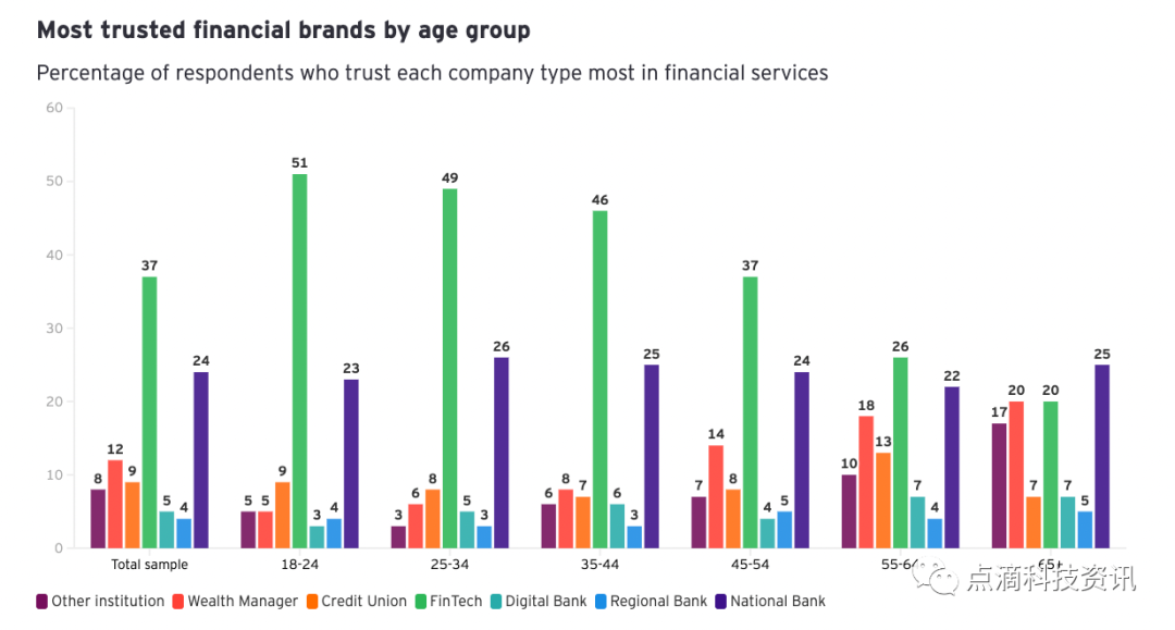 传统银行也有明显的变化,37% 的银行消费者声称他们最信任金融科技品牌。这导致传统银行仅获得33% 受访者的支持,财富管理公司在信任度方面落后12%(EY)。