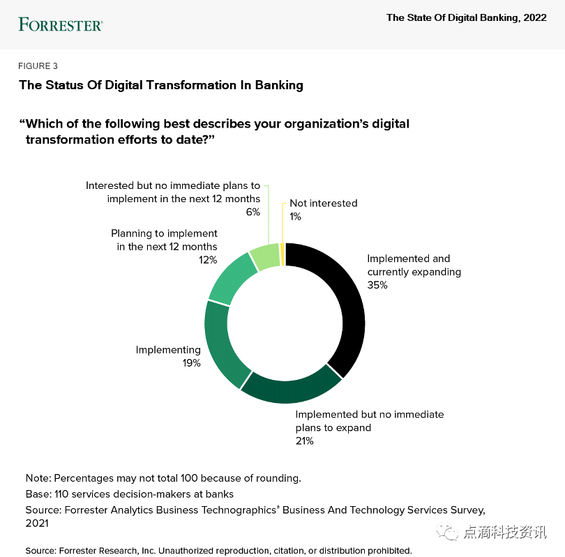 那么,金融服务行业在数字化转型方面表现如何?目前,金融趋势显示,35%的全球银行业高管表示,他们正在推进数字化计划和相关的购买决策。另一方面,12%的决策者仅计划实施转型,6%的决策者表示根本没有立即实施转型的计划(Forrester)。