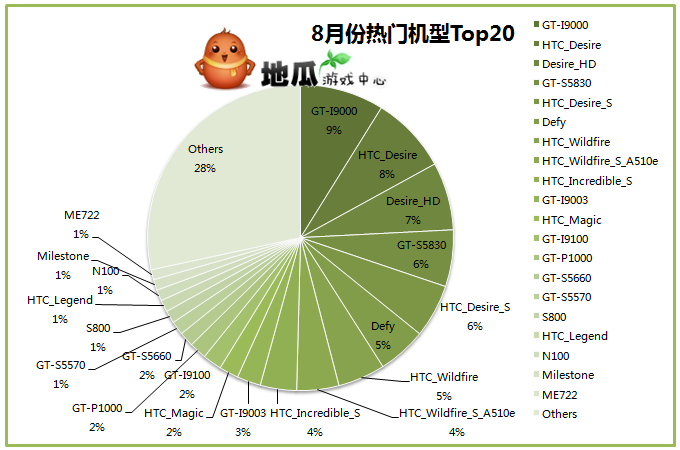 从上面的图表显示,之前一直在为第二、三位挣扎的三星I9000,在七月上升到了榜首之后,八月依然保持了第一名的好成绩,于此同时,前十名的波动非常微小。