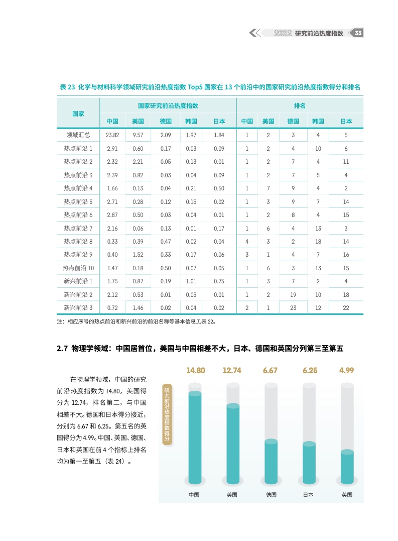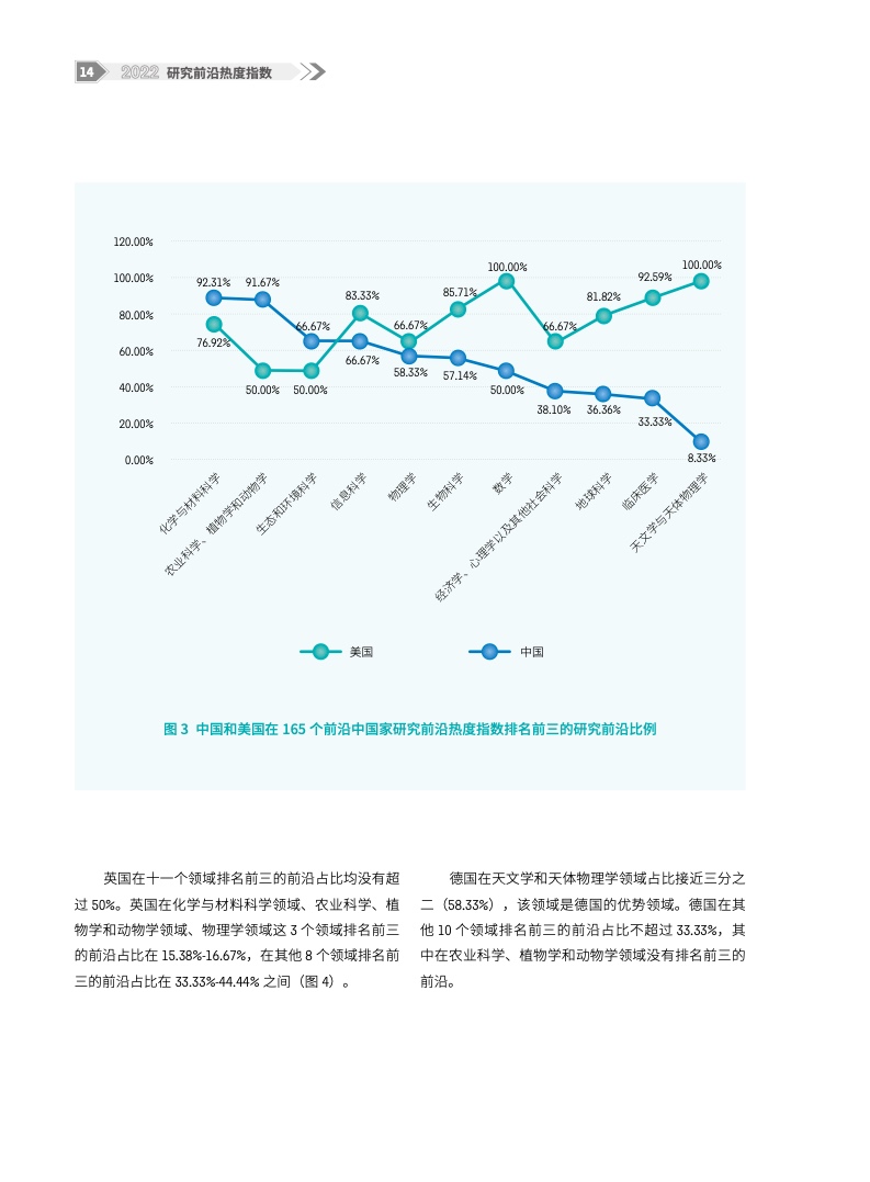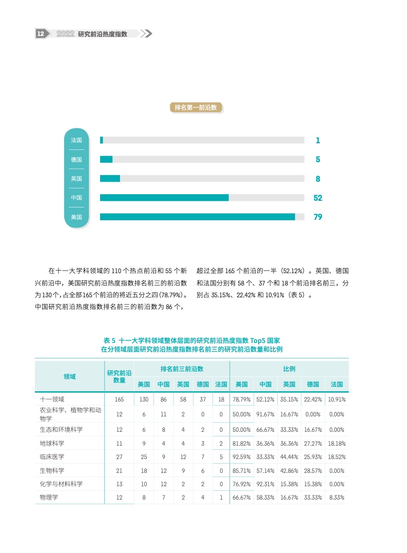 《2022研究前沿热度指数》在《2022研究前沿》基础上,评估了中国、美国、英国、德国、法国和日本等国家在上述研究前沿中的表现。从11个大学科领域整体层面的研究前沿热度指数来看,美国仍最为活跃,中国继续稳居第二,中美两强地位稳固;英国、德国分别排名第三和第四,位列第二梯队;法国虽然排名第五,但与前四有较大差距。从科学领域具体热度指数得分来看,中国在农业科学、植物学和动物学领域,生态与环境科学领域,化学与材料科学领域,物理学领域这4个领域均排名第一;临床医学领域、天文学与天体物理学领域仍是短板领域。
