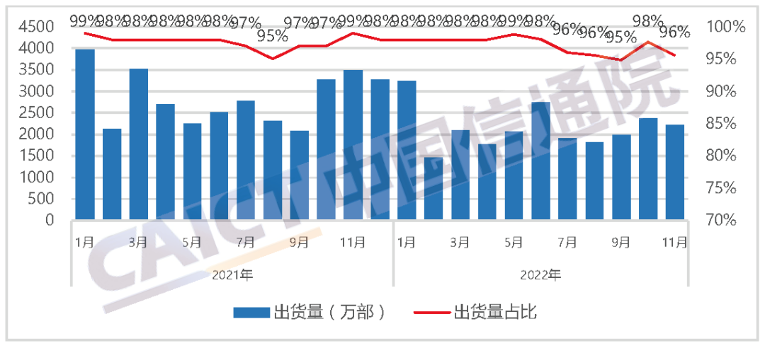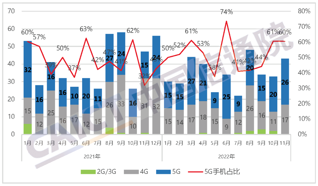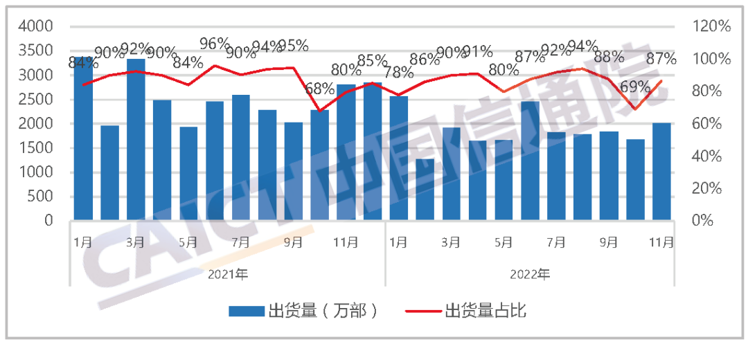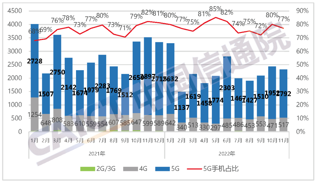 2022年1-11月,国内市场手机总体出货量累计2.44亿部,同比下降23.2%,其中,5G手机出货量1.91亿部,同比下降20.2%,占同期手机出货量的78.3%。