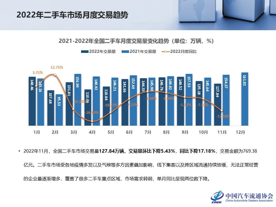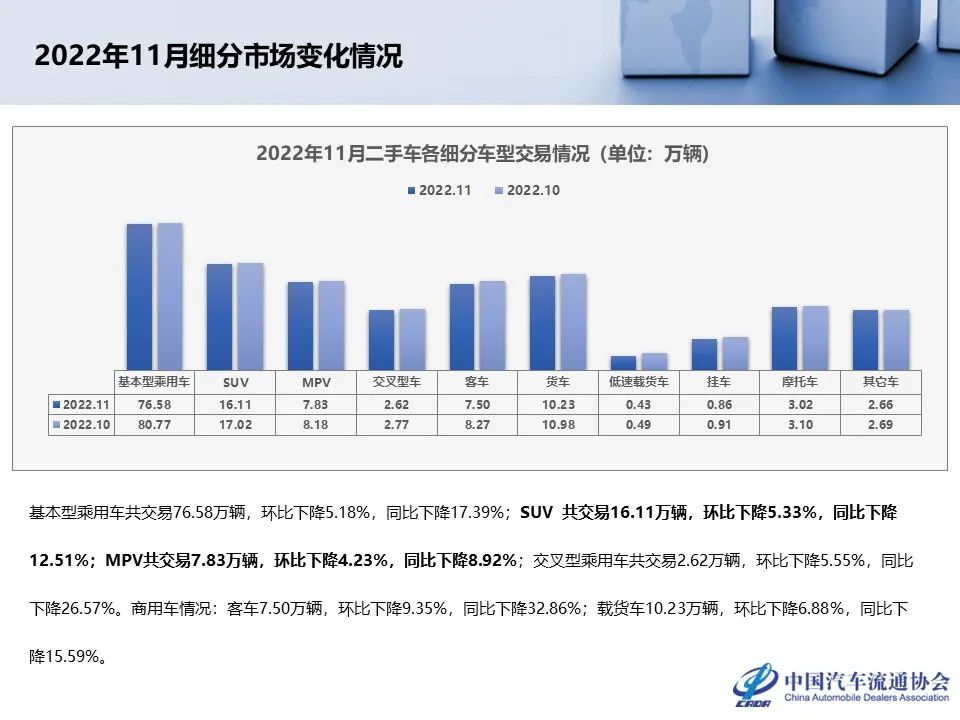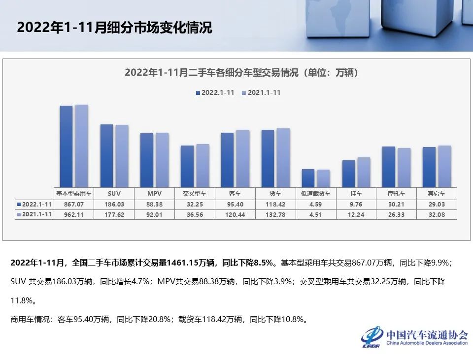 中国汽车流通协会:2022年11月全国二手车市场深度分析 更多阅读:中国汽车流通协会:2022年6月全国二手车市场深度分析中国汽车流通协会:2023年8月全国二手车市场深度分析中国汽车流通协会: 2021年9月全国二手车市场深度分析中国汽车流通协会:2021年11月全国二手车市场深度分析中国汽车流通协会:2022年4月全国二手车市场深度分析中国汽车流通协会:2023年7月全国二手车市场深度分析中国汽车流通协会:2022年4月全国二手车市场深度分析中国汽车流通协会:2020年3月份国内狭义乘用车市场销量达104.5万辆 同比下降40.4%中国汽车流通协会:2022年7月全国二手车市场深度分析中国汽车流通协会:2023年2月全国二手车市场深度分析中国汽车流通协会:2020年3月二手车市场简析中国汽车流通协会:2020年7月全国二手车市场简析中国汽车流通协会:2022年2月全国二手车市场深度分析中国汽车流通协会:2020年10月二手车市场简析中国汽车流通协会:2020年10月二手车市场深度分析