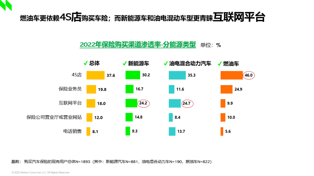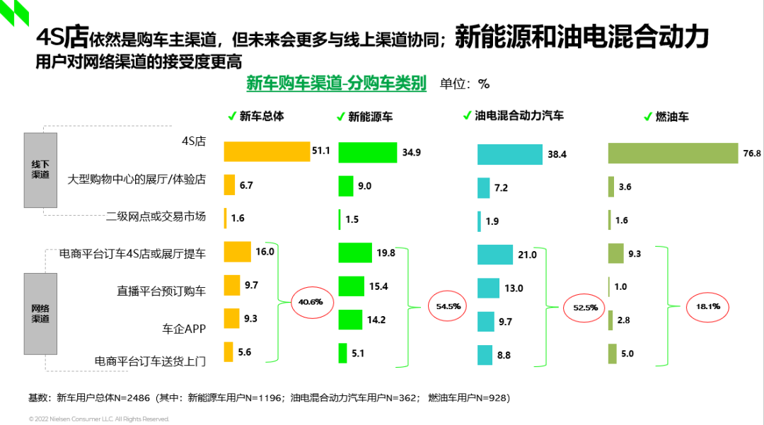 01、根据尼尔森IQ研究表明,总体看,4S店依然是新车和车险的主流购买渠道;互联网平台渗透率迅速提升;电话销售快速下降。同时,燃油车和新能源车消费者对不同渠道的青睐点不同,并表现出各自的渠道粘度。比如,76.8%的燃油车用户依然是通过4S店买车,新能源用户中,线上渠道购车的情况已经过半,达到了54.5%,而去年,这一比例只有35%。然而,从实际生活场景中看,消费者的买车渠道,有相当一部分需要线上与线下渠道协同,不是非此即彼。