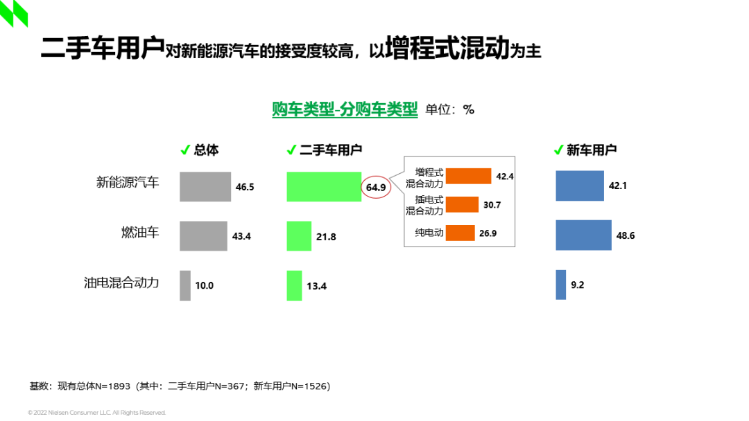 相比去年,二手车的购车均价下降明显,但新车价格稳定。二手车用户对新能源车的接受度会更高一些,有65%的人会更愿意去买一台新能源的车,其中增程式混合动力的比例稍高一些,其次是插电式混合动力,最后是纯电。二手车消费者选择新能源的理由与新车用户类似,用车成本、消费趋势和政策助推等多重因素叠加影响。同时,二手车消费者不选新能源车的顾虑也是与新车类似的,最主要是补能和安全方面的顾虑,此外,新能源的低残值和高售价对二手车消费者来说也是两个较为明显的消费障碍。