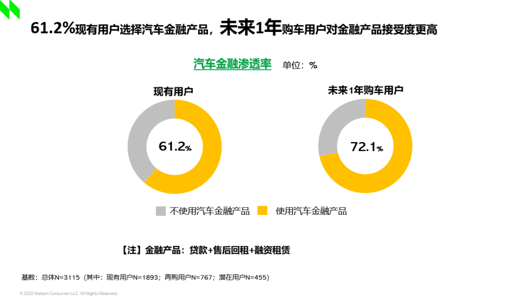 报告针对贷款、售后回租以及融资租赁三种形式对汽车消费信贷进行研究。今年的调查数据显示,61.2%的现有车主会选择汽车金融产品,对比去年是58%。在将来有再购计划的用户中,信贷接受比例更高,有七成略多的人会接受汽车金融产品,可预测,信贷渗透率还会逐步提升。