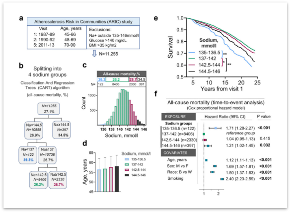图1:在社区动脉粥样硬化风险(ARIC)研究中,血清钠与全因死亡率的风险(来源:[1] )
