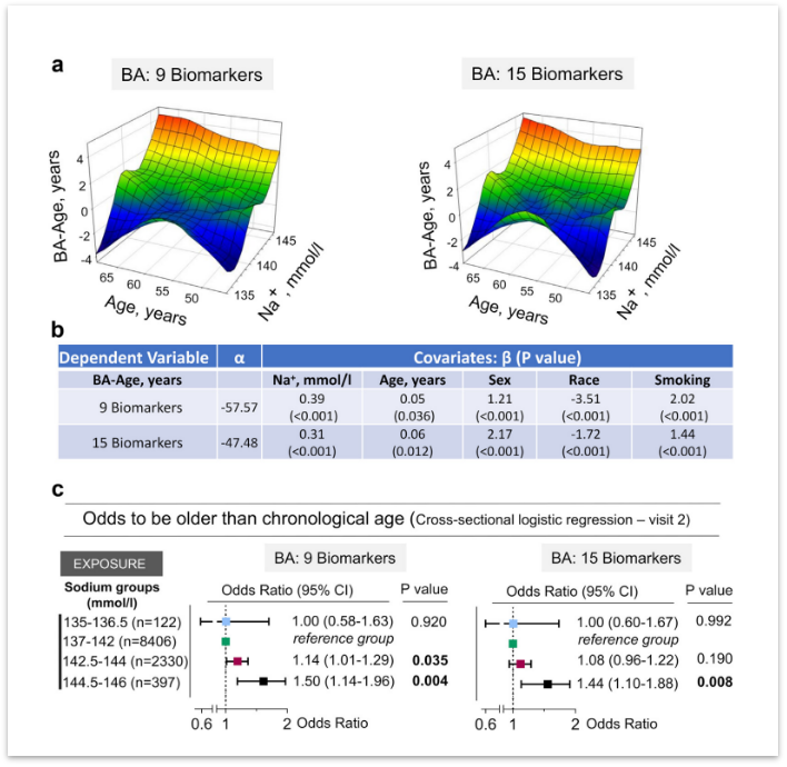 血清钠与死亡率和慢性疾病发生率的关联为研究者的猜想提供了初步支持,即饮水量不足可能与加速衰老有关。生物学年龄(BA)是测量衰老速度的一种新兴方法,为了直接评估血清钠与衰老过程的关系,紧接着,研究者依据年龄相关生物标记物估计了受试者的生物学年龄。