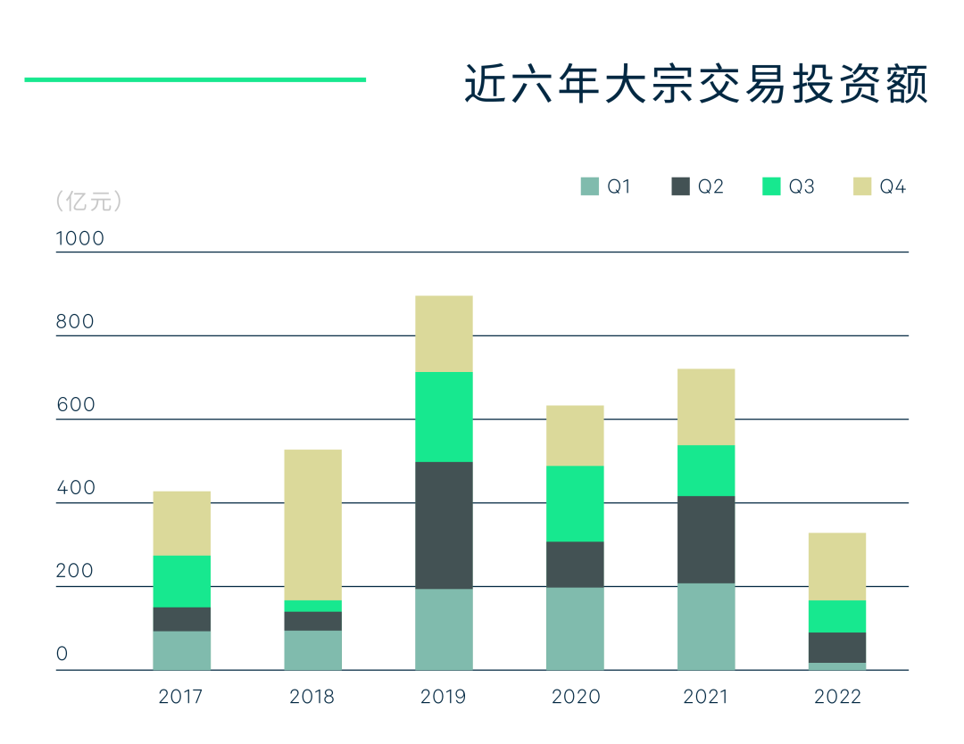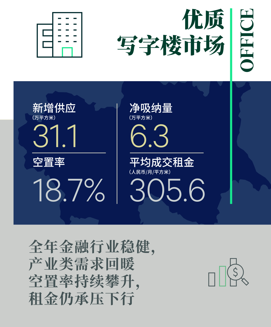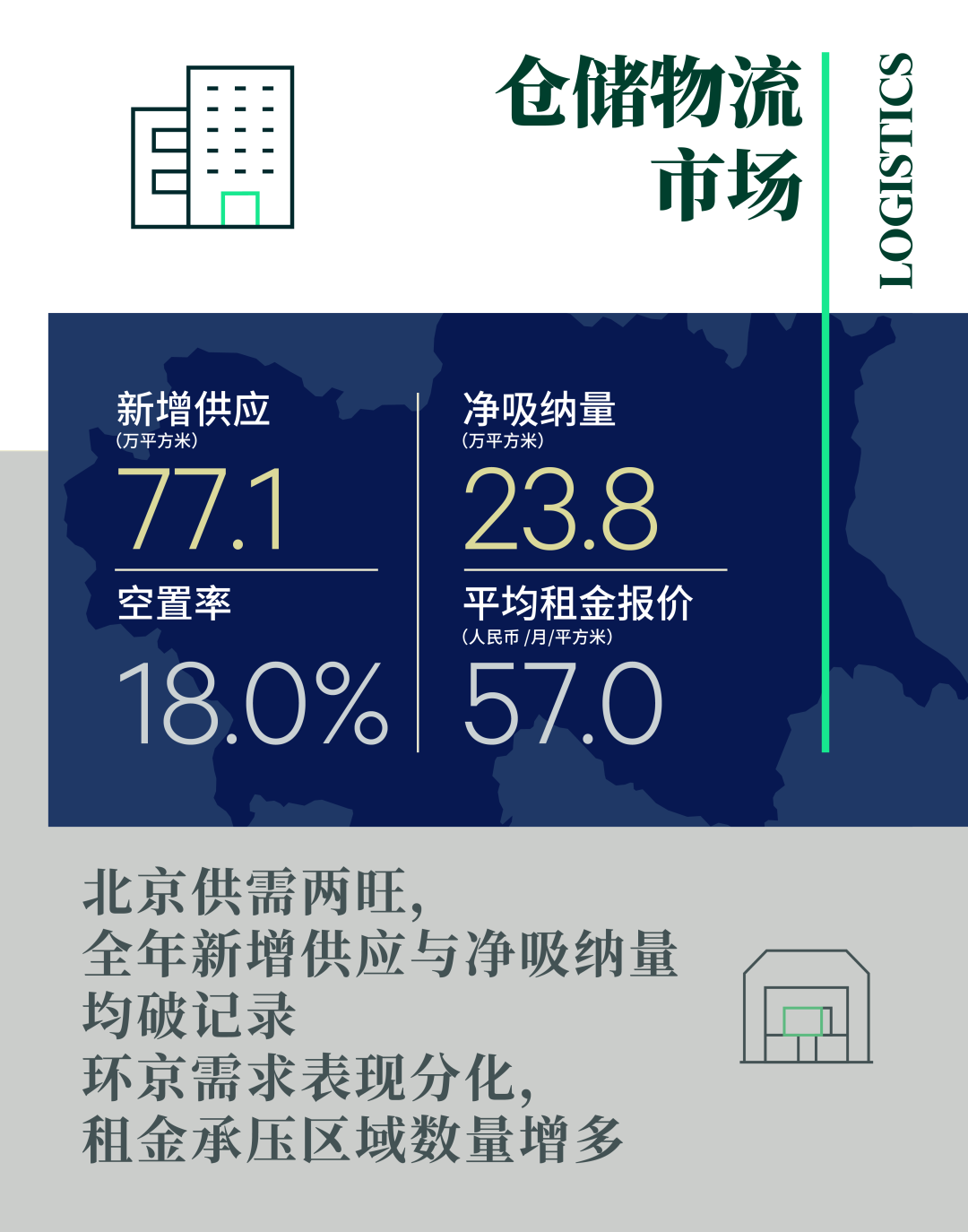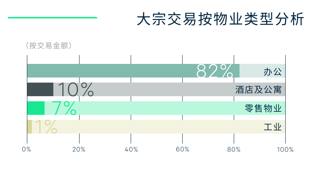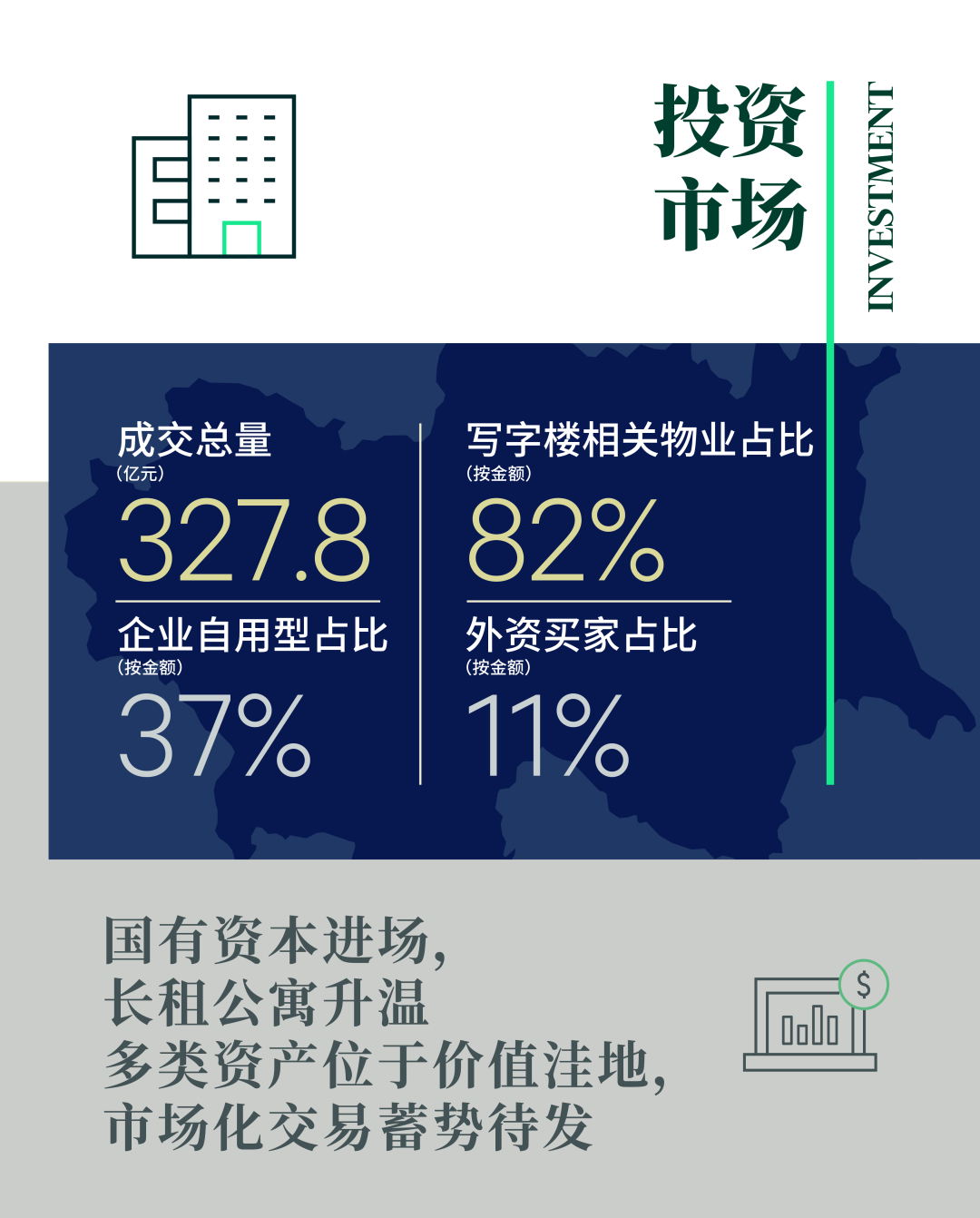 国有资本,包括保险、地产基金、企业、城投等各类主体入场布局,共完成7笔成交并占总金额的82%。全年看,自用型买家共完成17笔成交,占总成交额的37%,在投资需求低迷时成为北京市场的第一护盘手。受益于有更多体量大、有稳定现金流的核心型资产释放到市场,机构投资者成为市场最重要的投资需求来源,占成交总额35%,且贡献全年金额最高的两笔交易。境外投资者活跃度在年末有所恢复,并开始涉足不良资产、另类资产等风险和技术门槛都更高的资产类别,如凯德通过法拍购入位于CBD的博瑞大厦,以及趣存收购乐华梅兰家居超市以改造为自助式仓储。从投资物业类型看,尽管写字楼作为避险型资产成为全年投资交易的绝对主角,在全年成交额中的占比较往年有进一步提升,但四季度受REITs一、二级市场表现活跃和政府引导扶持政策不断出台的推动,以长租公寓为投资或改造目的的交易数量明显增加。