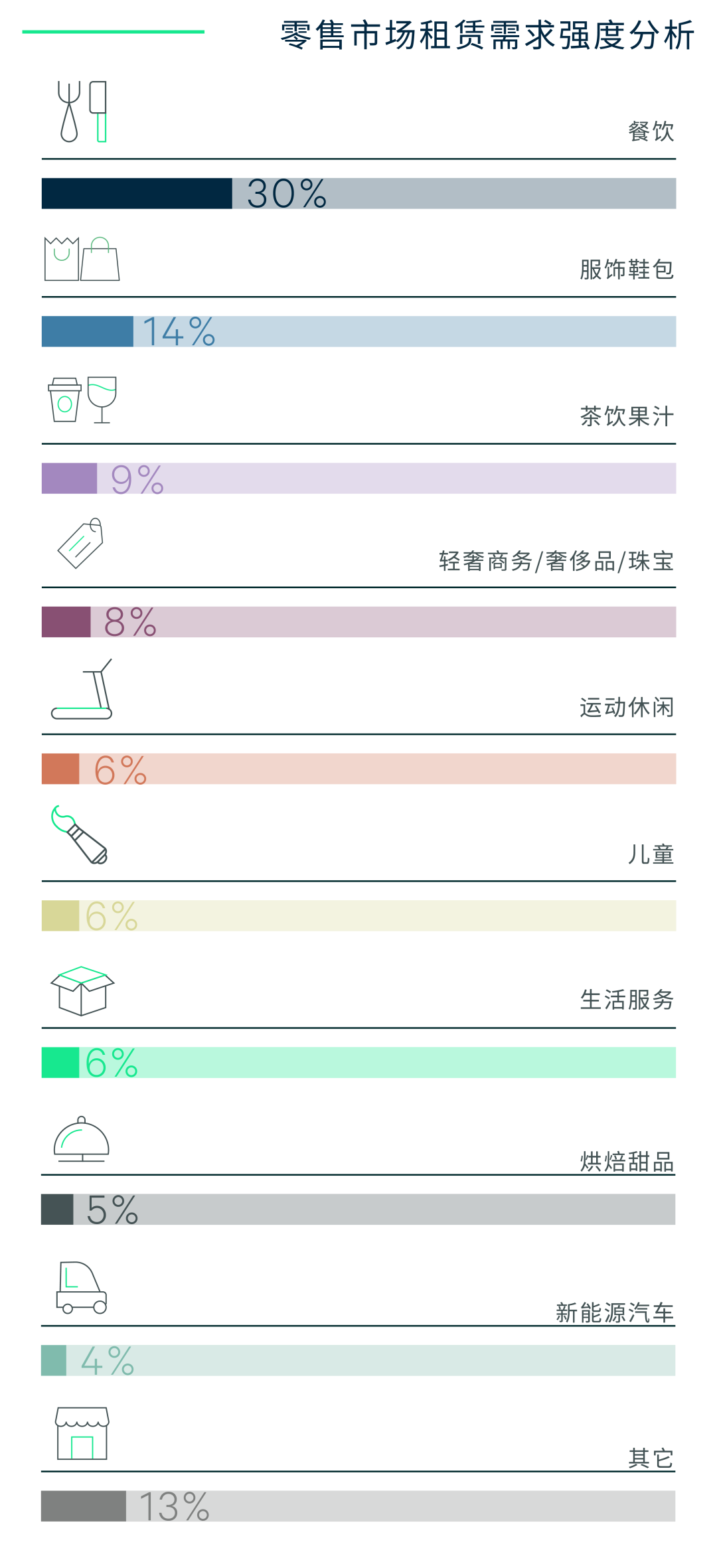 餐饮业态虽整体经营受疫情冲击严重,但新晋品牌对北京市场信心不减,仍旧以30%的新增店铺比例超过其他业态成为年度需求引擎,本季品牌能力强的高端或连锁餐饮持续布局,如雍雅合鲜、松鹤楼苏式汤面、添好运分别落位银泰in01、西单大悦城和朝阳合生汇。零售业态方面,核心商圈中高端服饰业绩稳定,如SKP、国贸商城等以奢侈品、轻奢商务、珠宝首饰等高端消费为主要定位的商业体持续繁荣并在季内录得Chanel、Chole、Maison Margiela等店铺新增或升级。始祖鸟、Nike、波司登等户外运动品牌拓店节奏稳健。AVATR、蔚来、集度、小鹏等新能源汽车品牌亦有表现,在选址人口密度较大的非核心商圈的同时,抓住空档期入驻核心商圈标杆项目。咖啡茶饮(如乐乐茶、M Stand、Smiley Tea)及烘焙甜品(如Venchi、LeTAO、艾炒酸奶)等高频率、低价位的大众品类更新迭代较快,也是恢复“烟火气”最快的业态。