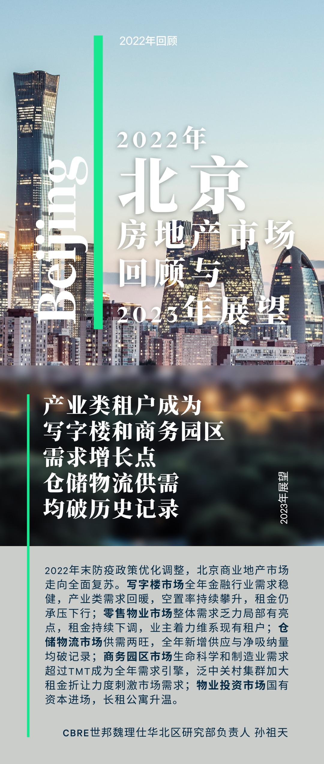 “随着疫情管控全面开放,国内开始全力拼经济,商务活动加速恢复,金融环境持续向好,将极大提振2023年投资者对商业地产投资信心。当前的北京物业投资市场,处于价值洼地的优质稀缺资产涌现,将吸引有敏锐洞察的长期投资者加速在周期底部布局。随着更多元的投资主体开始或重启对北京市场的配置,市场化的交易将重新活跃并占据市场主导。近期,证监会表示研究推动REITs试点范围拓展至市场化的长租房及商业不动产等领域,也为有稳定现金流的优质物业带来重大利好。随着买卖双方心态成熟度的提升,以未来租金收入和资产运营表现为核心判断依据的价值投资思维日益成为市场主流,交易双方的预期差异将缩小,有利于促进交易达成。”