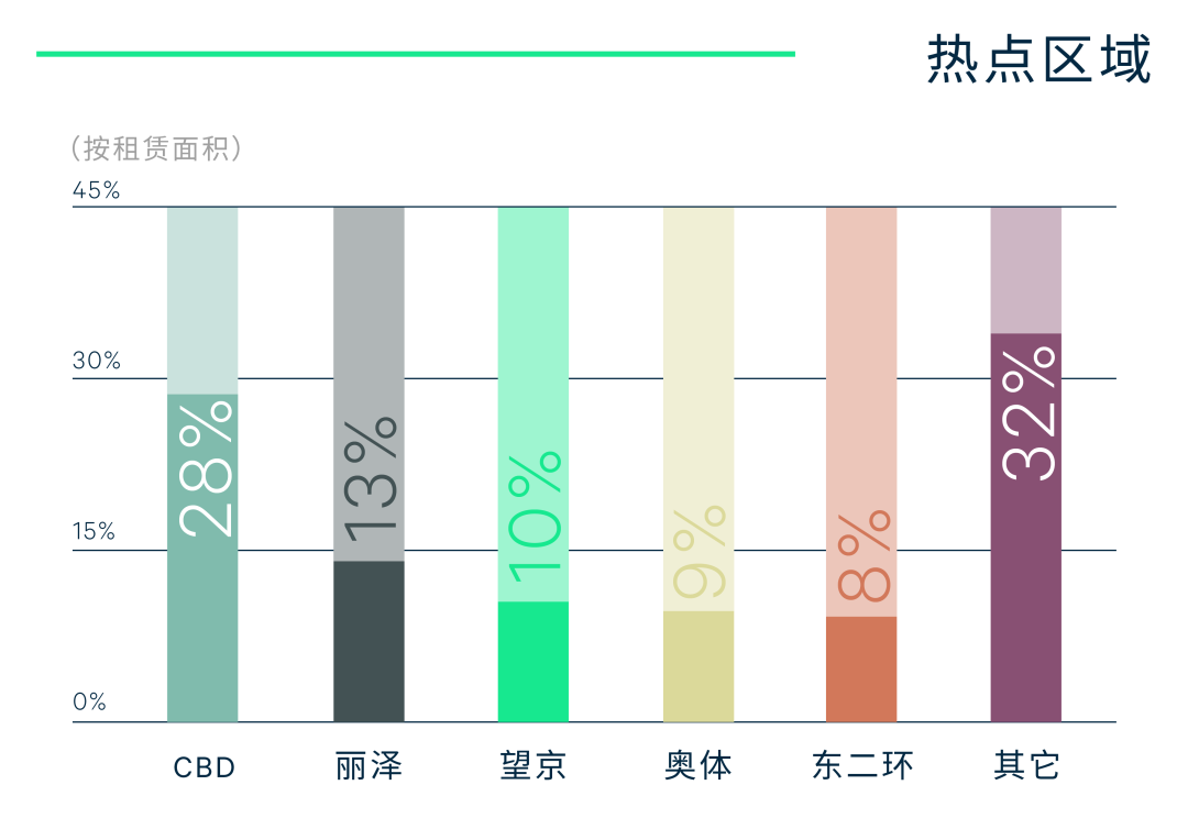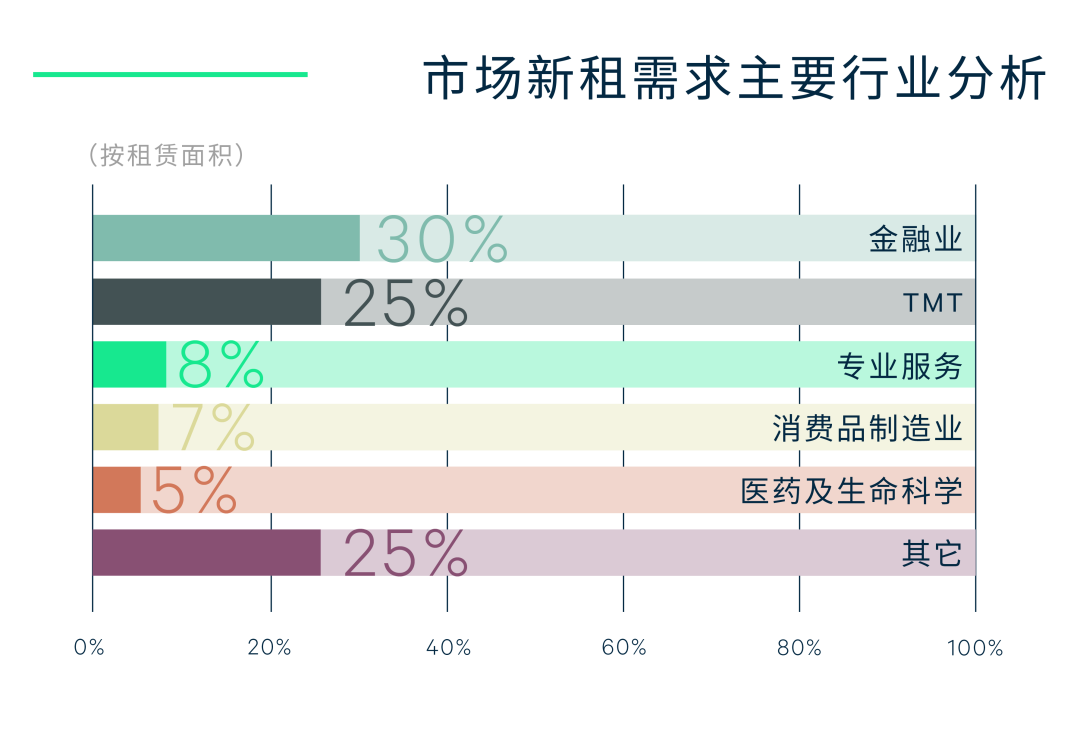 尽管商务活动受疫情延续影响,新租交易面积环比下降8%,但企业整合、缩减、腾退现象有所缓解,使得全市净吸纳量结束了前两个季度的负值回升至1.7万平方米。金融稳居需求榜首,基金、保险和证券公司持续在优质楼宇和行业集聚的CBD、金融街、东二环和丽泽等区域积极扩租和搬迁;TMT需求集中在软件开发,互联网+服务亦见回暖;此外,能源及公共事业类租户的新租需求活跃度攀升。受全年互联网行业退租影响,全年净吸纳量降至6.3万平方米的历史低位,市场新租面积仍可维持在2018-2020年的平均水平。制造、医药、能源等产业类租户抓住升级搬迁的机会窗口,填补多个区域传统租户退潮后空白。此外,在市场不确定环境下,决策周期更短、更灵活的2000平方米以下面积交易更容易落地,成为全年需求主力。