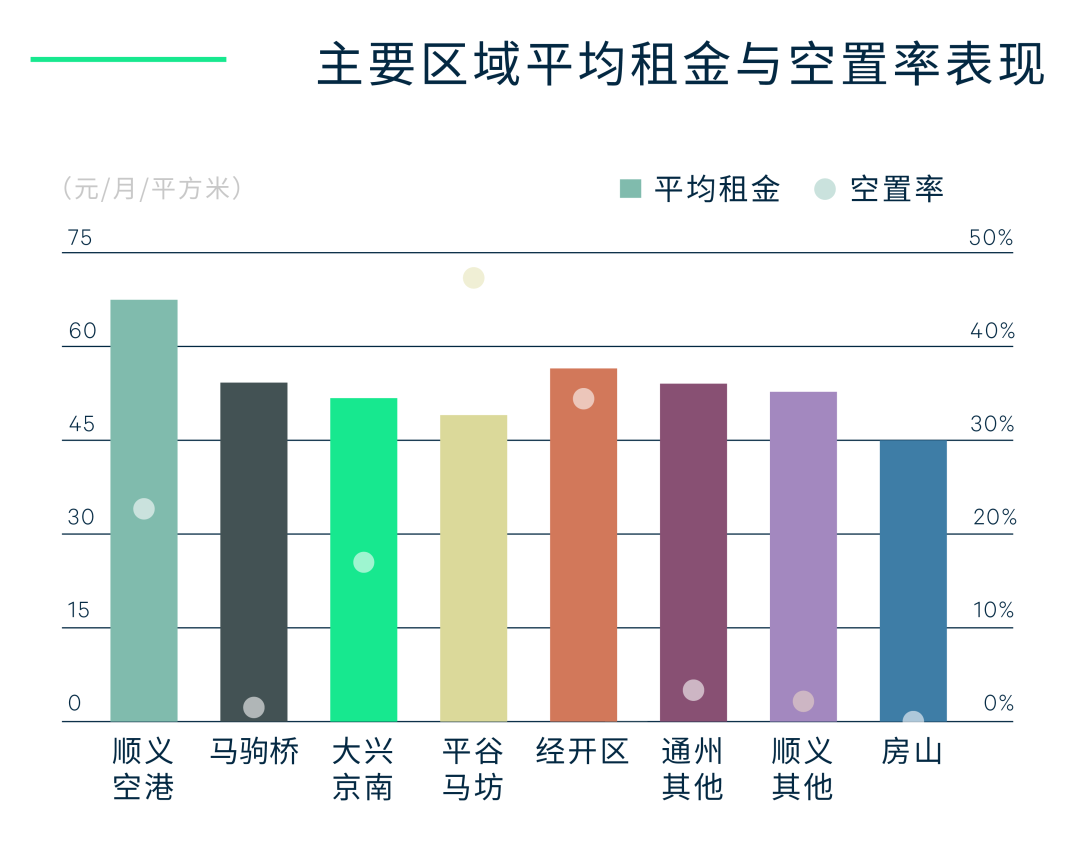 新增供应密集入市和疫情影响下,季内全市平均租金增速较上季度有所放缓,同样本比环比上涨0.5%至每月每平方米57.0元,年度同比涨幅2.9%。其中年涨幅最大的子市场当属符合城配刚需的通州、大兴京南及马驹桥等区域。