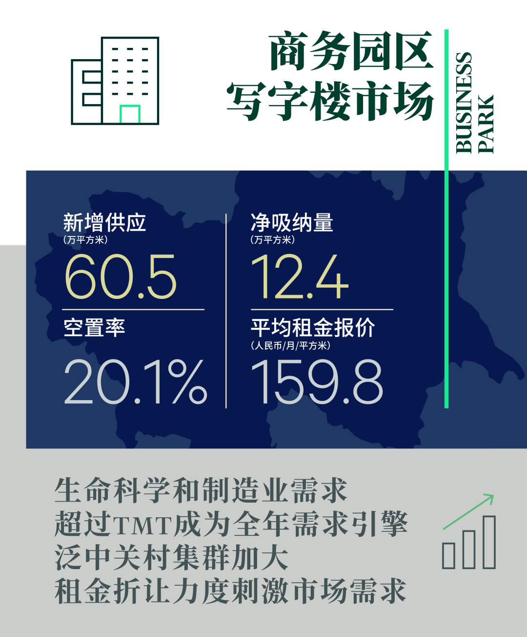 本季度全市净吸纳量由负转正录得3.4万平方米,但头部互联网企业持续整合缩减面积,使得泛中关村集群连续第四个季度净吸纳量录得负值,全年区域净吸纳量共计-19.3万平方米,空置率攀升至历史最高位13.3%。而其他子市场四季度并未录得明显面积腾退,其中大兴和经开区需求受生命科学地产新项目的拉动尤为明显。四季度在疫情反复的影响下,整体市场活跃度较上半年继续呈放缓态势,主力去化需求来自成熟医药企业的扩租以及TMT类租户的扩租和搬迁,另外以集成电路为主的工业品制造类租户亦有表现。
