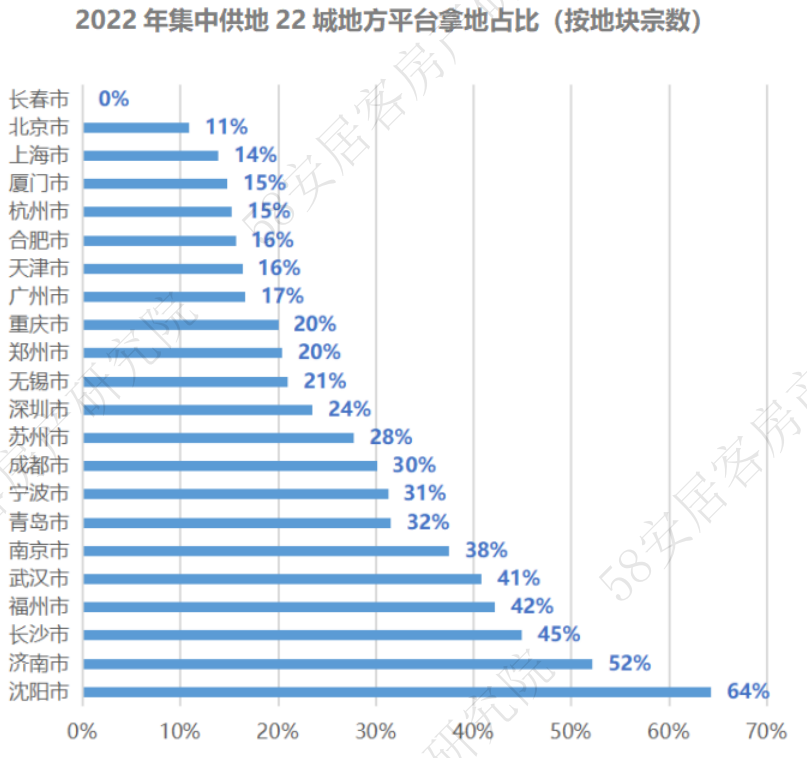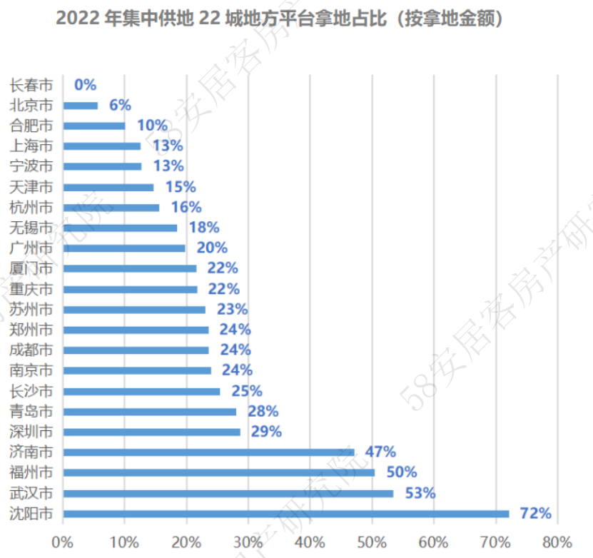从具体城市看,沈阳在2022年集中供地中,地方平台拿地占比达64%,居各城市之首;从金额上看,则占到全年集中供地拿地总金额的72%。武汉、福州、济南的相应占比也达53%、50%、47%。与此同时,北上广深四个一线城市今年集中供地也有地方平台类企业参与,从拿地金额上看,也出现分化,其中,北京地方平台拿地金额仅占6%,上海占13%,广州占20%,深圳占29%。