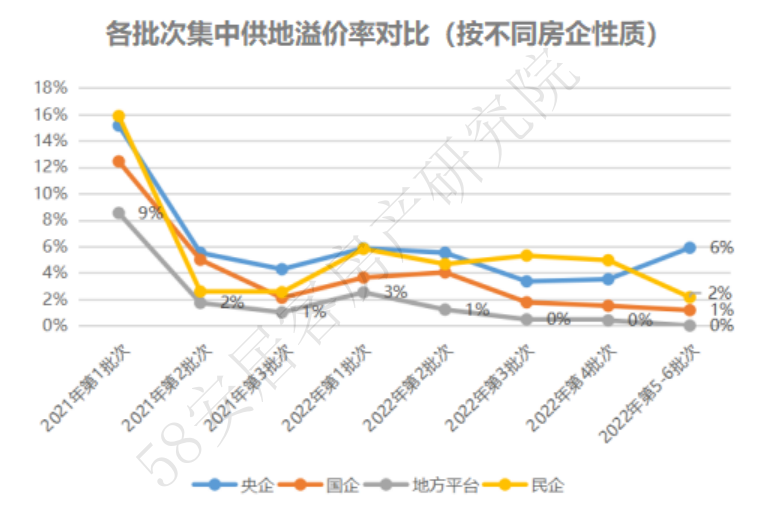58安居客房产研究院分析师许之静指出,通过对不同企业类型房企拿地的溢价率对比,发现地方平台类企业的拿地溢价率持续保持在最低位,基本为底价成交,说明地方平台拿地依旧以托底目的为主。而央企和民企相对来说,拿地的溢价率较高,央企得益于雄厚的资金实力,而民企在逆周期下资金压力相对较大,仅一些城市龙头民企在发力。