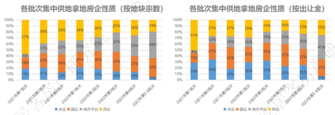 纵观2021年各批次集中供地情况看,民企拿地量占比呈现逐批次减少,而地方平台则相反呈现逐批次拿地占比增加。58安居客房产研究院统计数据显示,2022年以来各批次集中供地,从拿地数量看,地方平台拿地占比从20%增长至44%,从拿地金额看,占比则从16%增长到41%,占比增长的幅度更大。而从纯央企和国企的拿地占比看,字2021年第二批次起,占比并没有明显的变化。