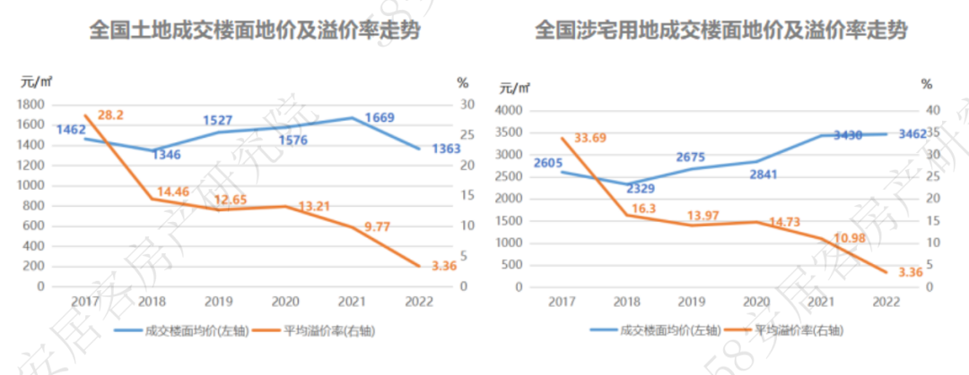 2022年全国土地成交平均楼面地价为1383元/平米,较上一年大幅下滑18%,与2018年持平,溢价率也跌至历史最低。从涉宅地块看,楼面地价出现小幅上扬至3462元/平米,但溢价水平同样呈现下滑,数据显示,2022年全国涉宅地块成交溢价率仅为3.36%。