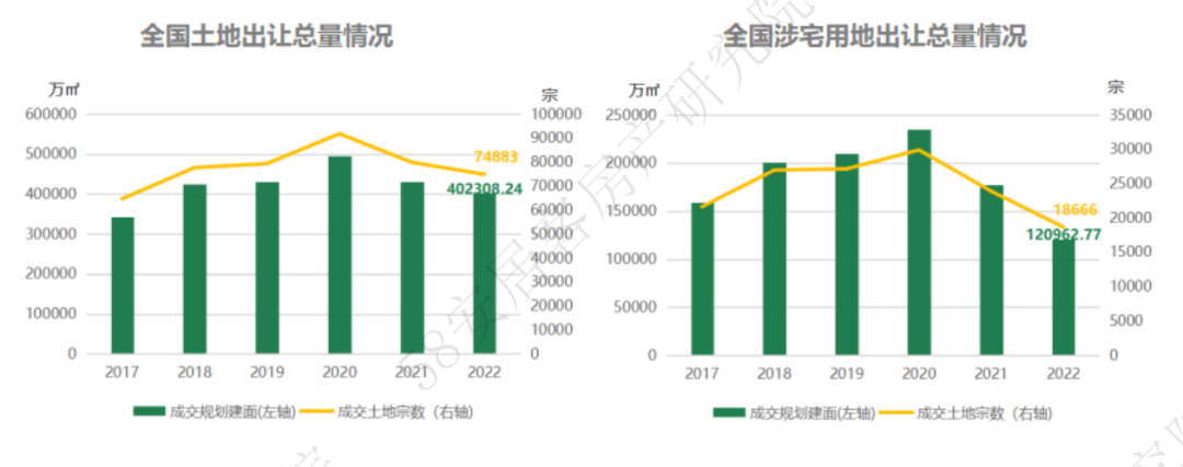 2022年在继续推行集中供地的制度下,全国共出让地块74883宗,合计规划建面402308万平米,分别同比下滑6%和7%。从涉宅地块看,下滑幅度则更为明显,2022年共成功出让地块18666宗,合计规划建面120963万平米,分别同比下滑22%和32%。