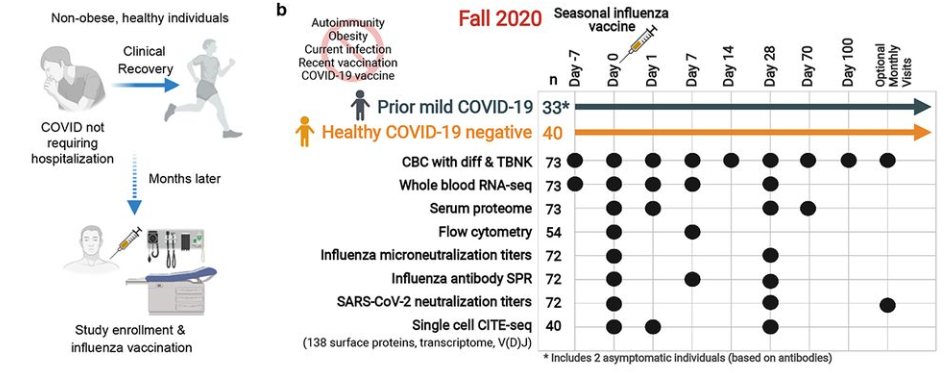 今天要说的这项研究,就尝试在分子水平上对比了新冠康复者和未感染者的免疫能力,并比较了他们接种流感疫苗之后的反应。