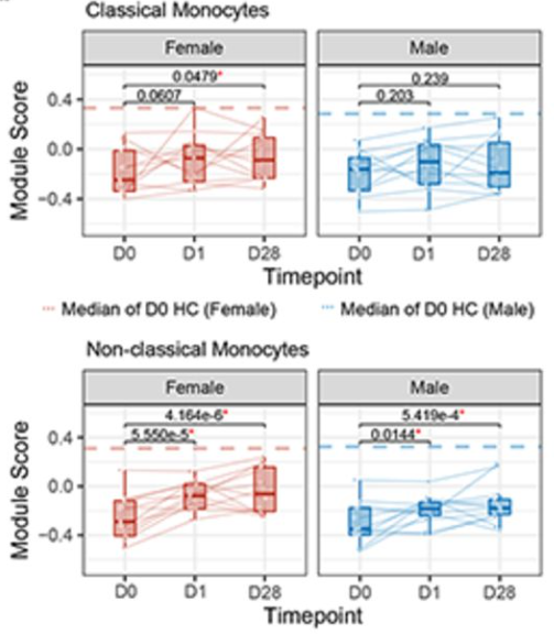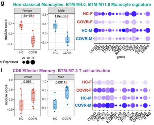 有意思的是,这种变化表现出了明显的性别差异,男性康复者的单核细胞和常规/髓系树突状细胞等髓系细胞的占比明显比女性康复者和健康对照更高,而CD8+中央记忆T细胞和效应记忆T细胞的活化也更加明显。