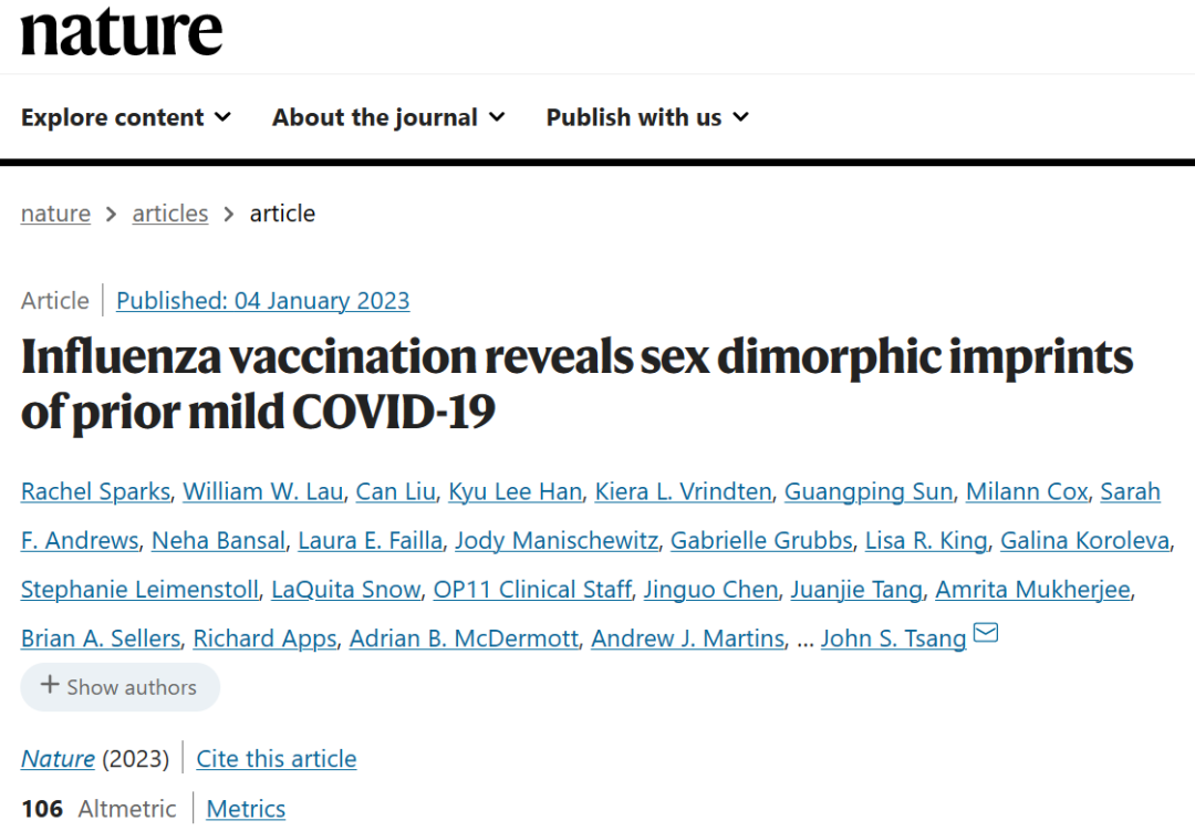 本周《自然》杂志上线了一篇来自美国国立卫生研究院的新论文,讨论了新冠康复后免疫系统的变化。研究结果发现,新冠康复者的T细胞活性特征所有升高,但单核细胞中有关先天免疫的基因表达降低。有意思的是,新冠康复者接种流感疫苗的效果出现了性别差异,男性康复者能产生更好的免疫反应。