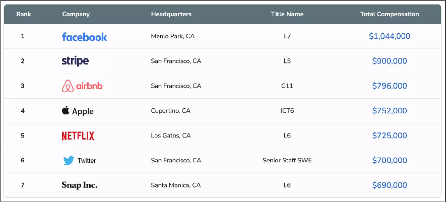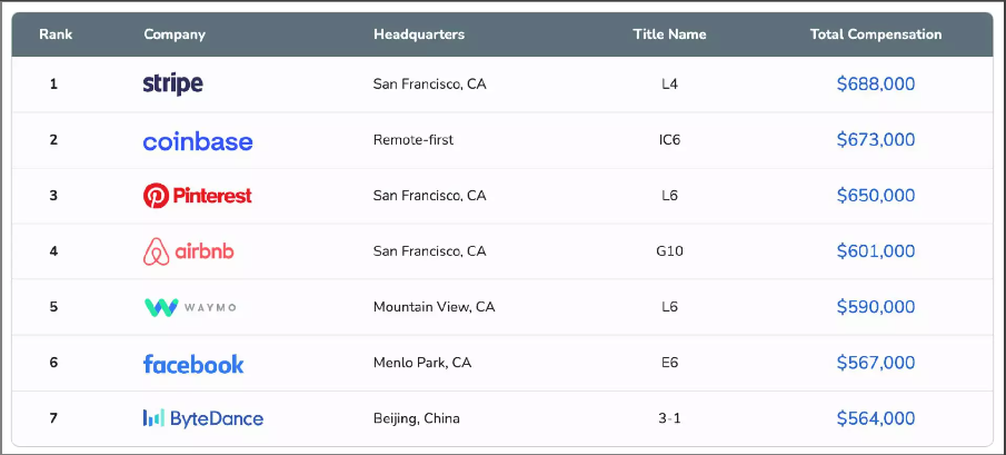 在 Levels.fyi 发布的 2021 年度程序员薪酬报告中,字节跳动以 43 万美元(约合 295 万元人民币)高级工程师薪酬排在第五,对应字节跳动职级为 2-2。这也是中国科技公司首次出现在这份报告中。
