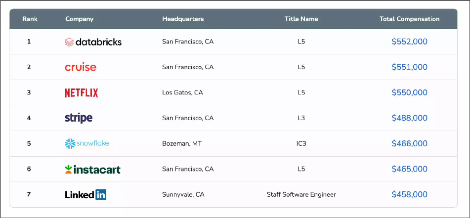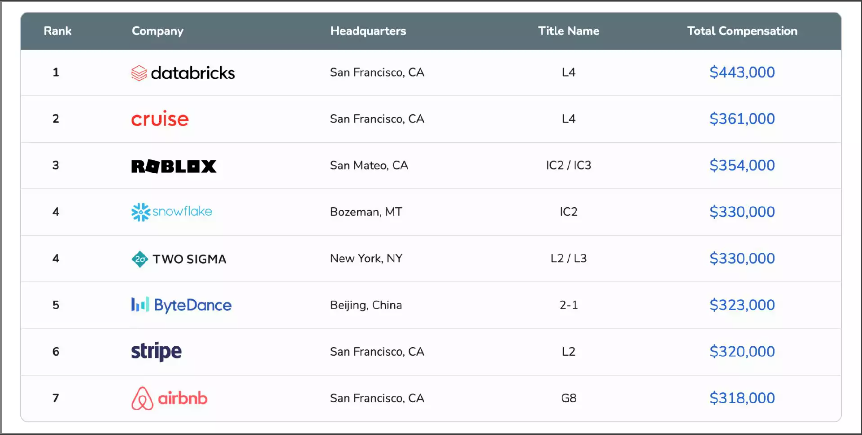 报告显示,在高级工程师薪酬排名中,排在第一的依旧是数据湖提供商 Databricks,薪酬为 55.2 万美元(约合 378 万元人民币);职场社交平台 LinkedIn 以 45.8 万美元的薪酬位列第七。