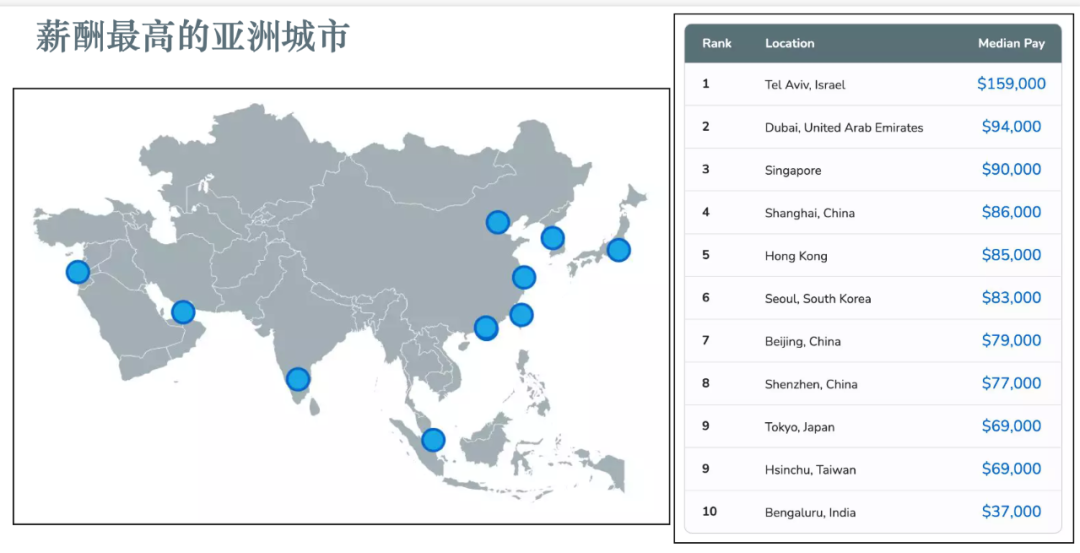 在亚洲范围内,程序员薪酬最高的前三个地区是以色列首都特拉维夫(15.9 万美元)、迪拜( 9.4 万美元)和新加坡( 9 万美元)。