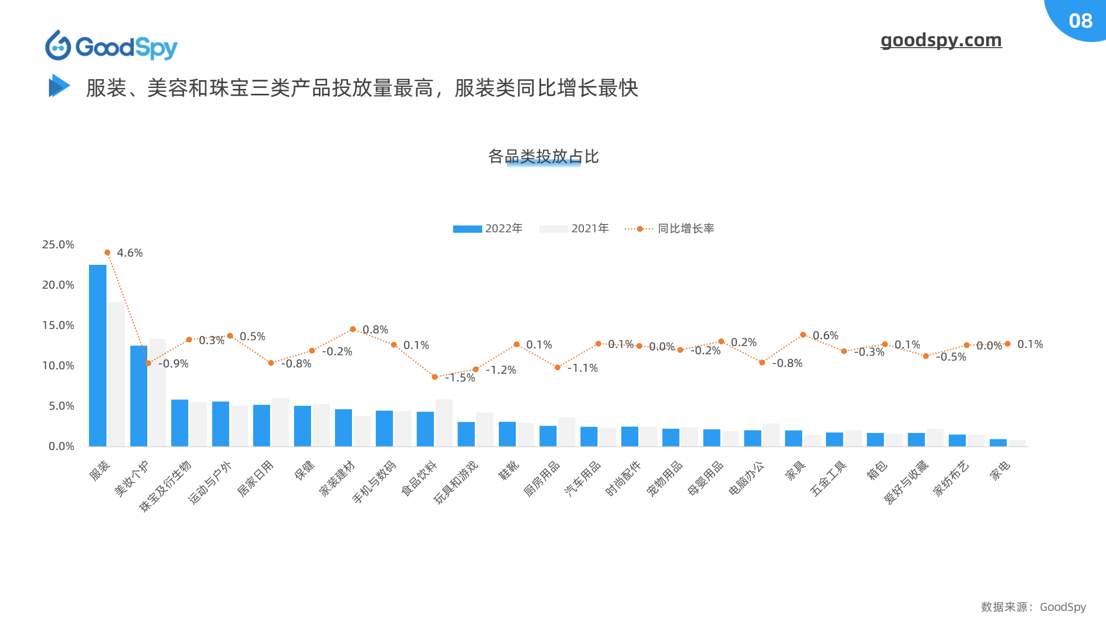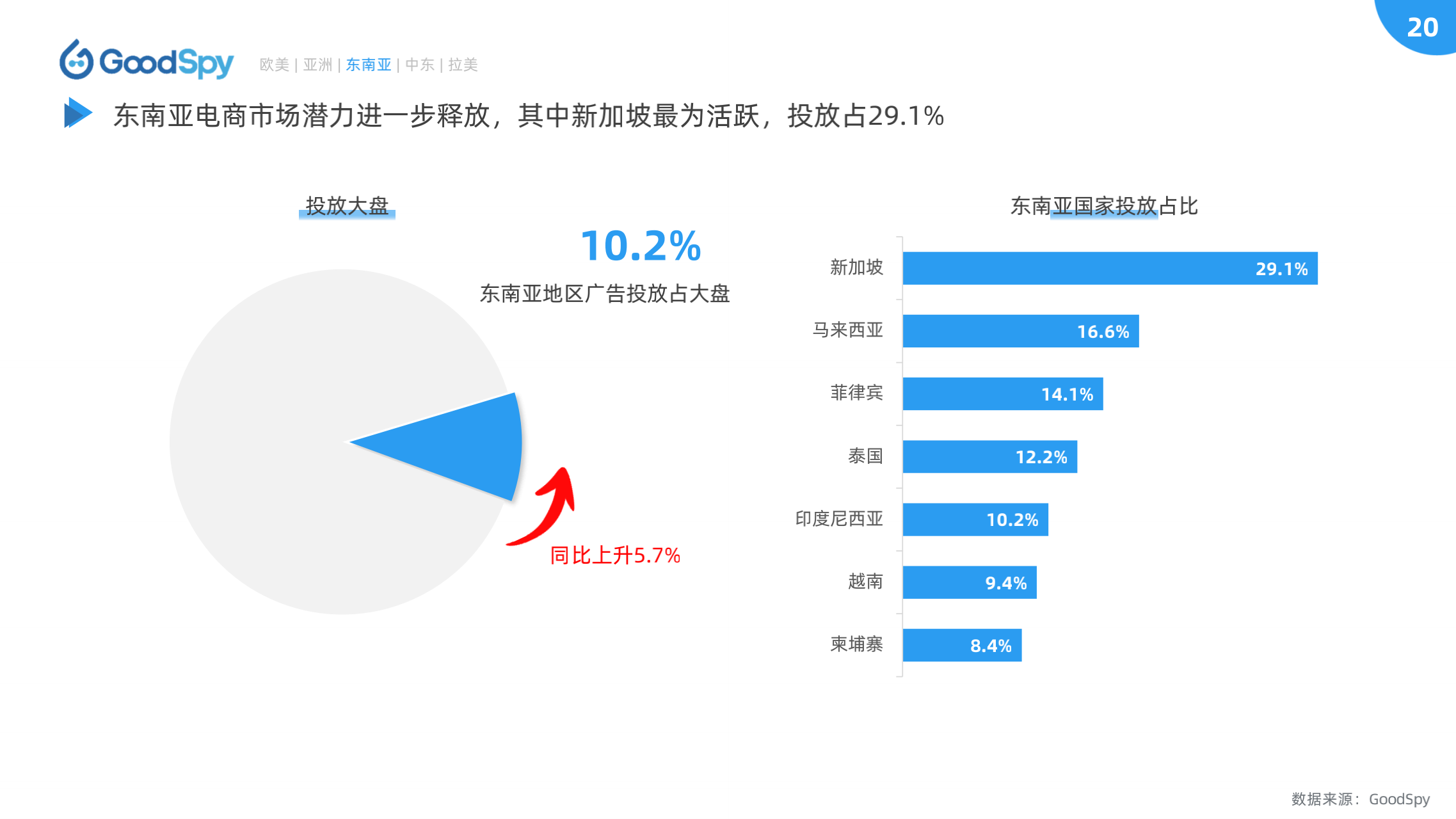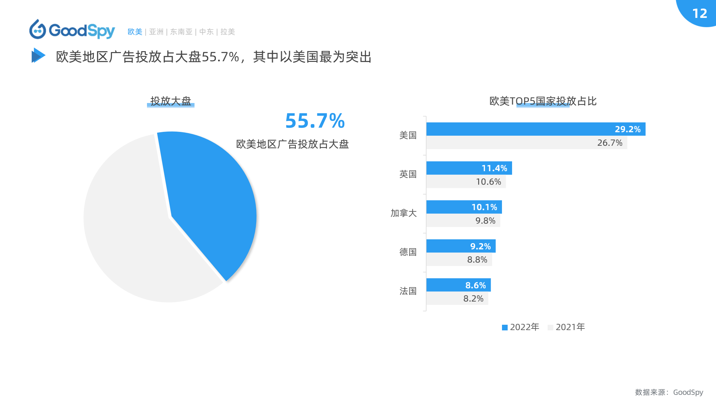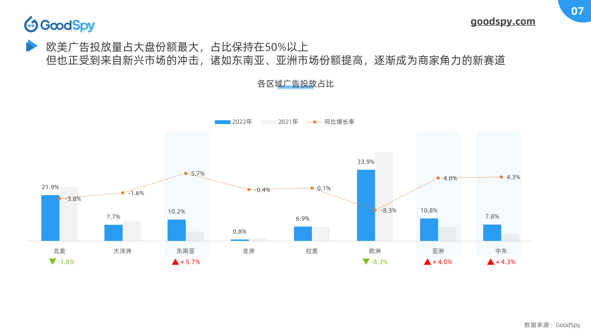 据 GoodSpy 数据显示,2022年全球独立站广告投放呈上升趋势,8、9月竞争尤为激烈。另一方面,欧美的投放份额正在被东南亚、中东等地区所蚕食,这些新兴市场逐渐成为诸多商家、品牌角力的新赛道。2022年独立站广告大盘有何新表现?全球电商市场有何新变化?为了更全面地观察行业变化,GoodSpy 发布《2022年独立站电商营销报告》。