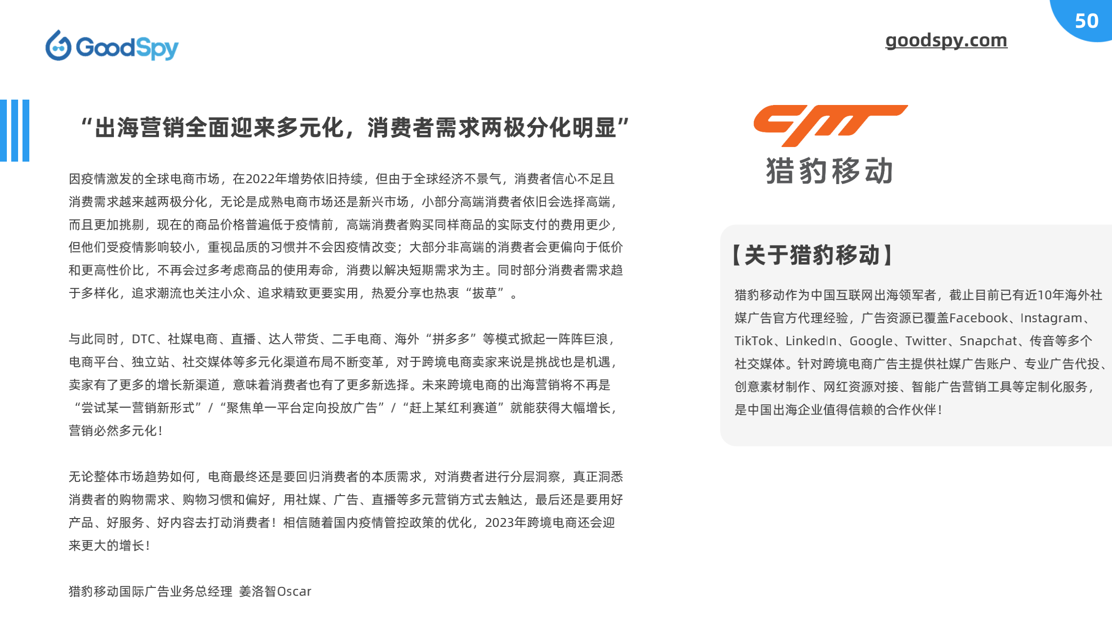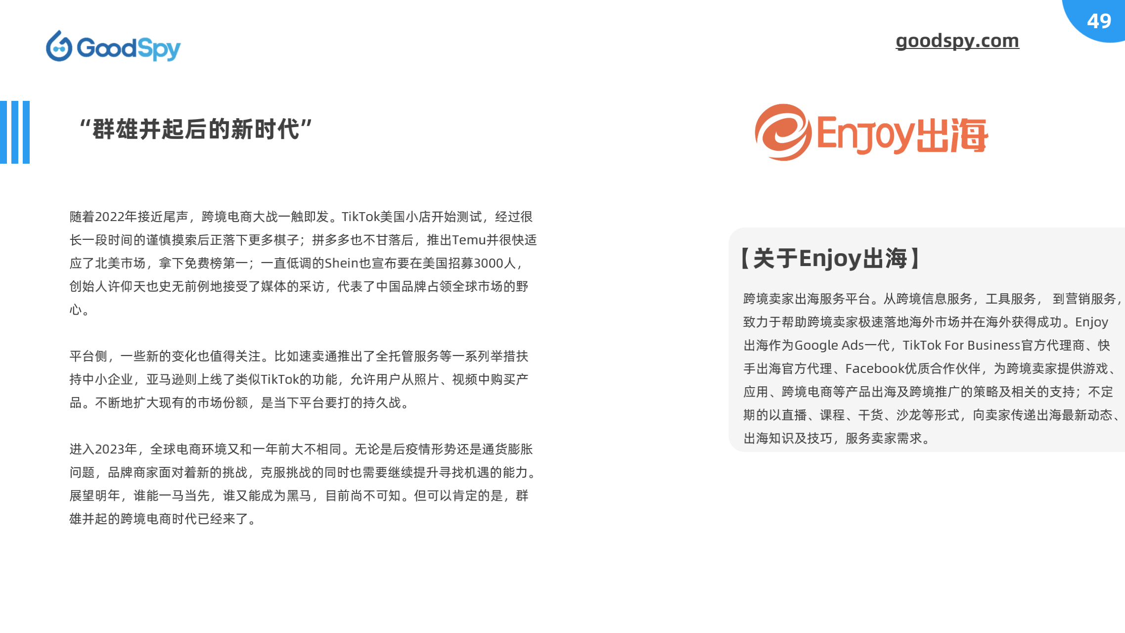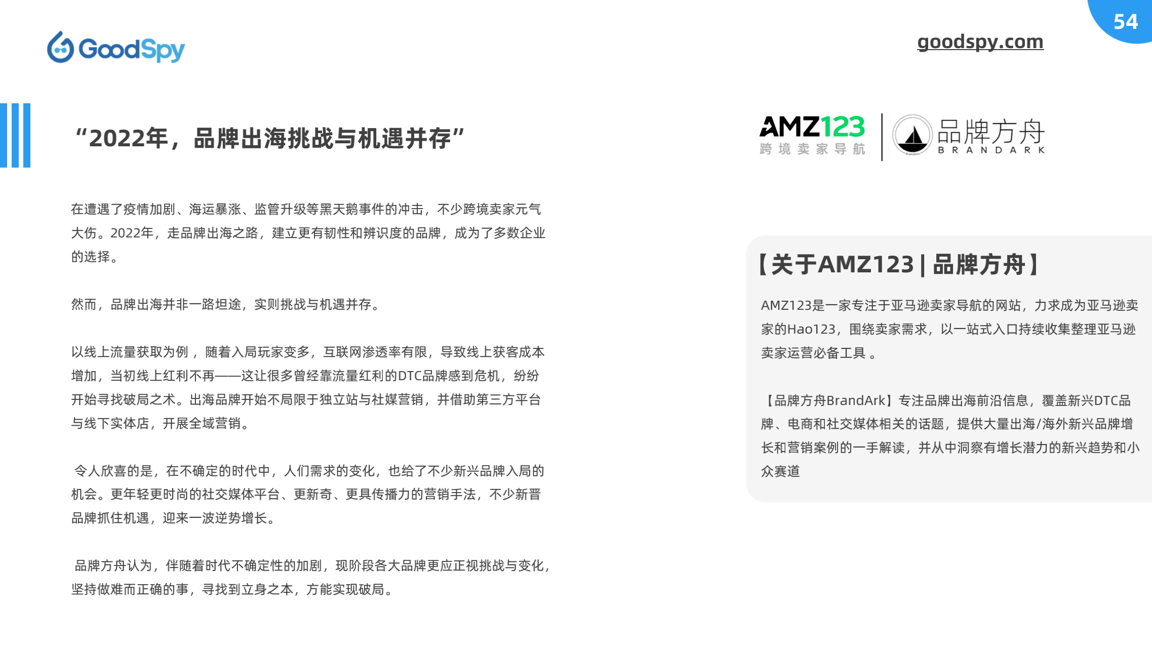 本报告由 GoodSpy 发布,同时邀请 Enjoy出海、猎豹移动、跨境眼观察、跨境知道、易点天下、AMZ123-品牌方舟 等行业上下游共同探讨,从全球独立站广告投放洞察、全球重点市场分析、DTC品牌案例拆解和行业观点四大方面为跨境商家提供市场、选品、营销等方面的情报和洞察。