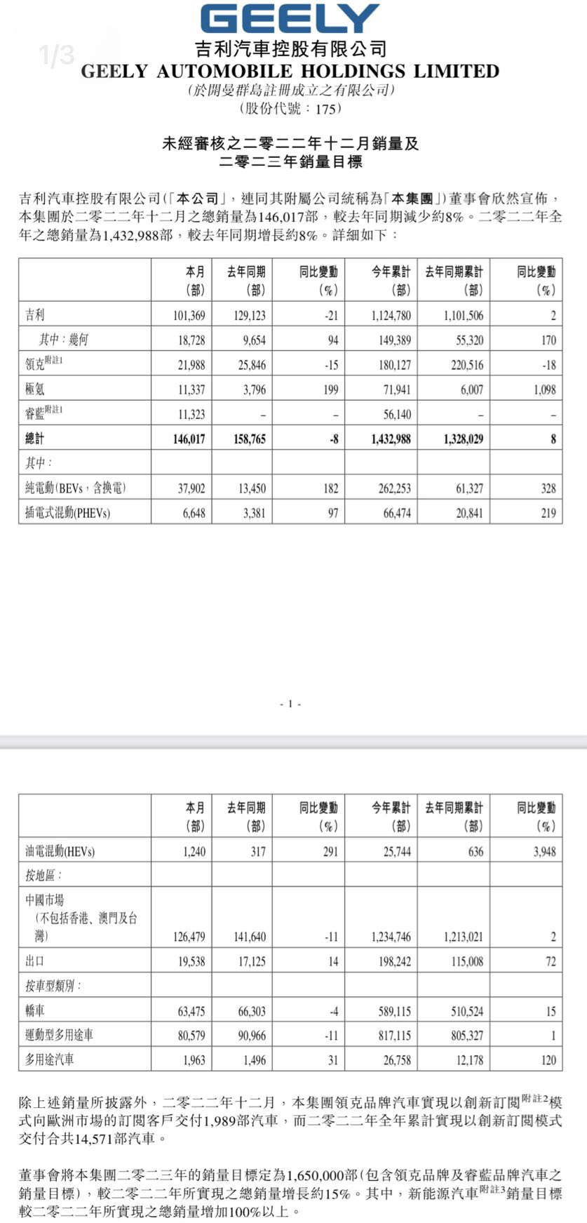 近日吉利汽车在港交所公告,集团 2022 年 12 月总销量为 14.6 万部,较去年同期减少约 8%。2022 年全年总销量为 143.3 万部,较去年同期增长约 8%。