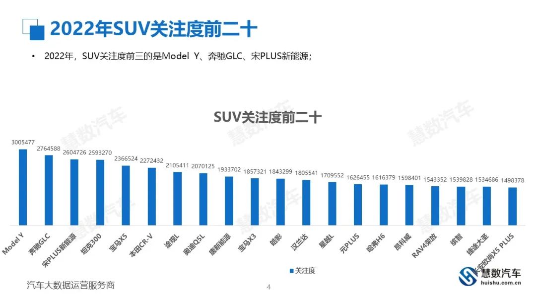 2022年,SUV关注度排行榜前三的车系是Model Y、奔驰GLC、宋PLUS新能源;