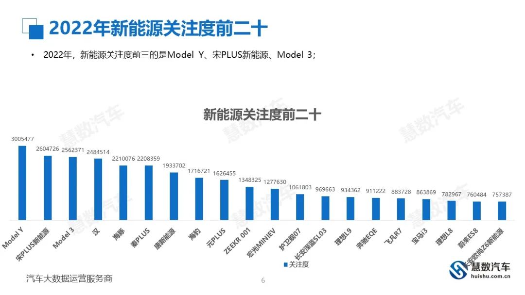 2022年,新能源关注度排行榜前三的车系是Model Y、宋PLUS新能源、Model 3;