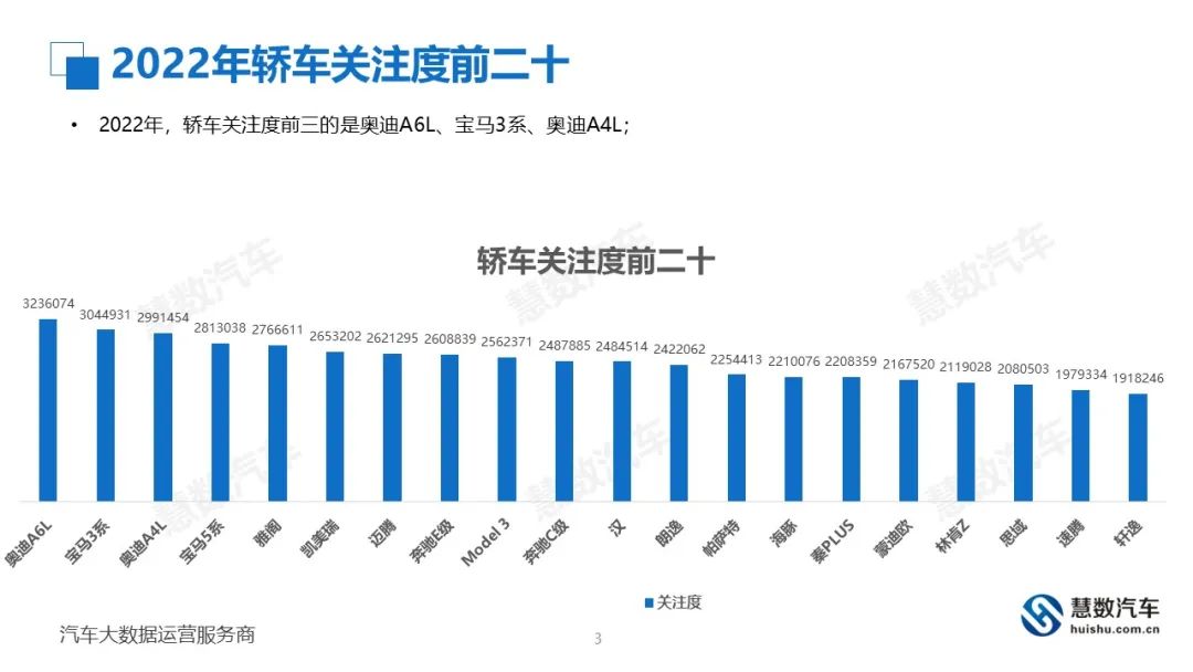 2022年,轿车关注度排行榜前三的车系是奥迪A6L、宝马3系、奥迪A4L;